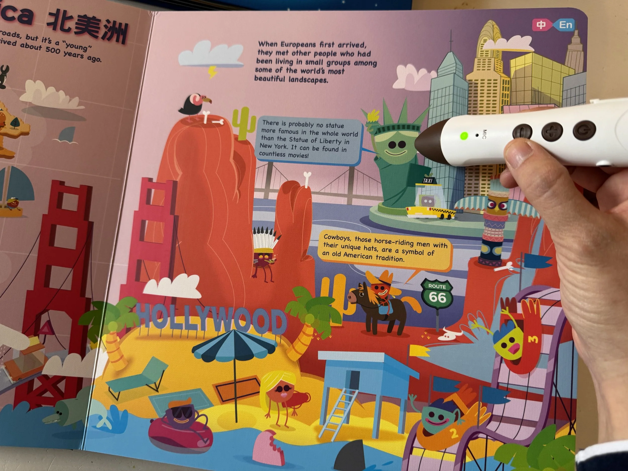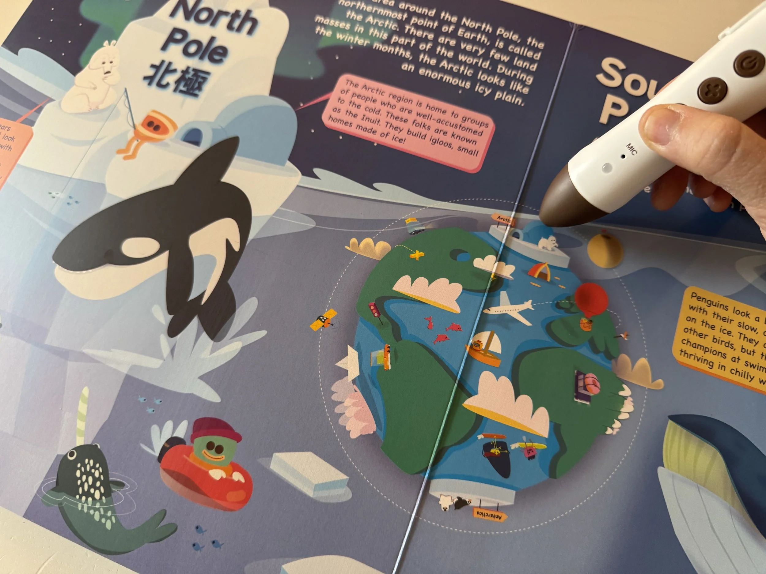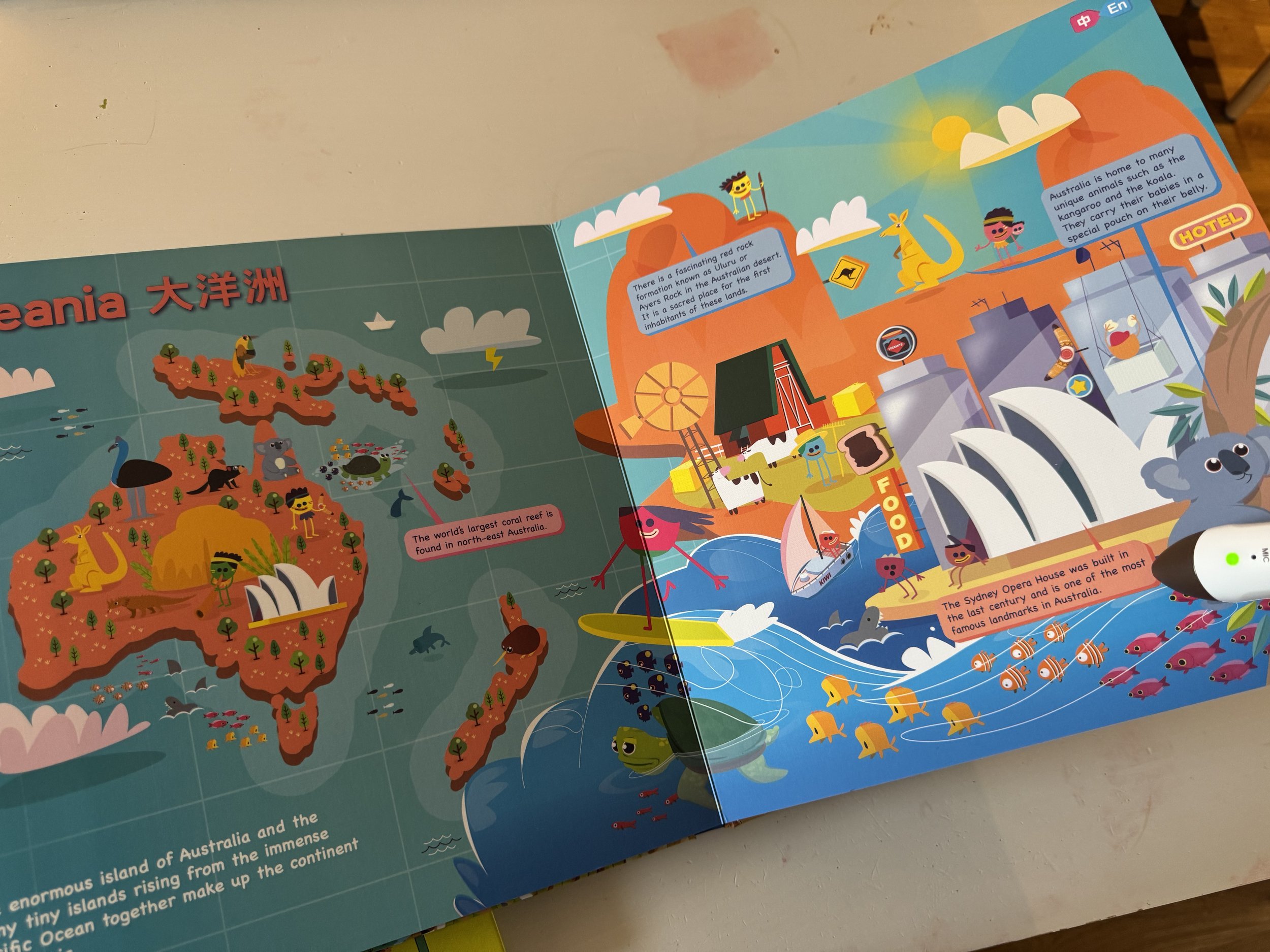 用點讀筆點選頁面上的插圖,每個小物件、 人物都有精心錄製的音效與對白喔!隨手一點都是彩蛋,有些甚至還會帶來更多關於地景地貌與氣候等延伸補充知識呢!