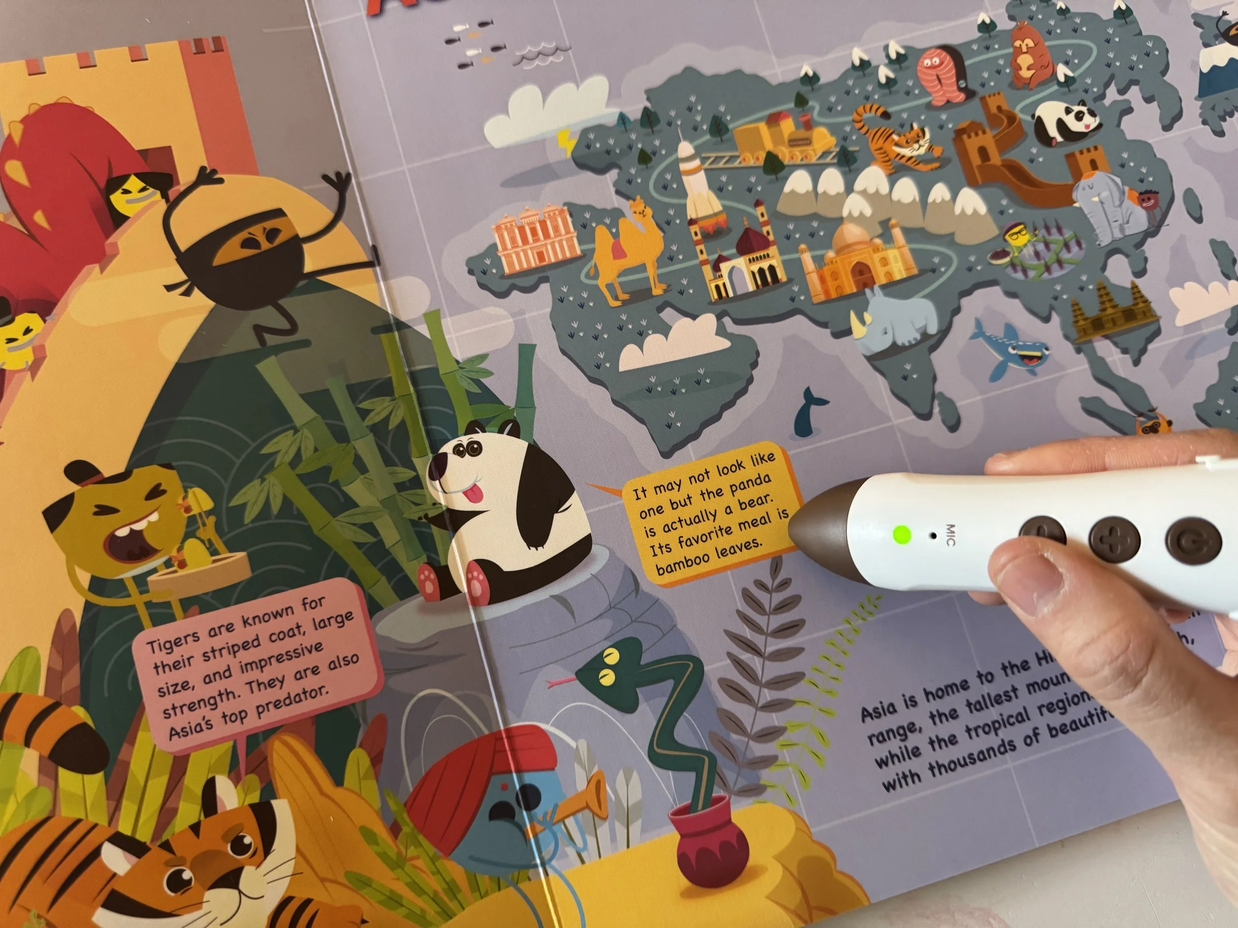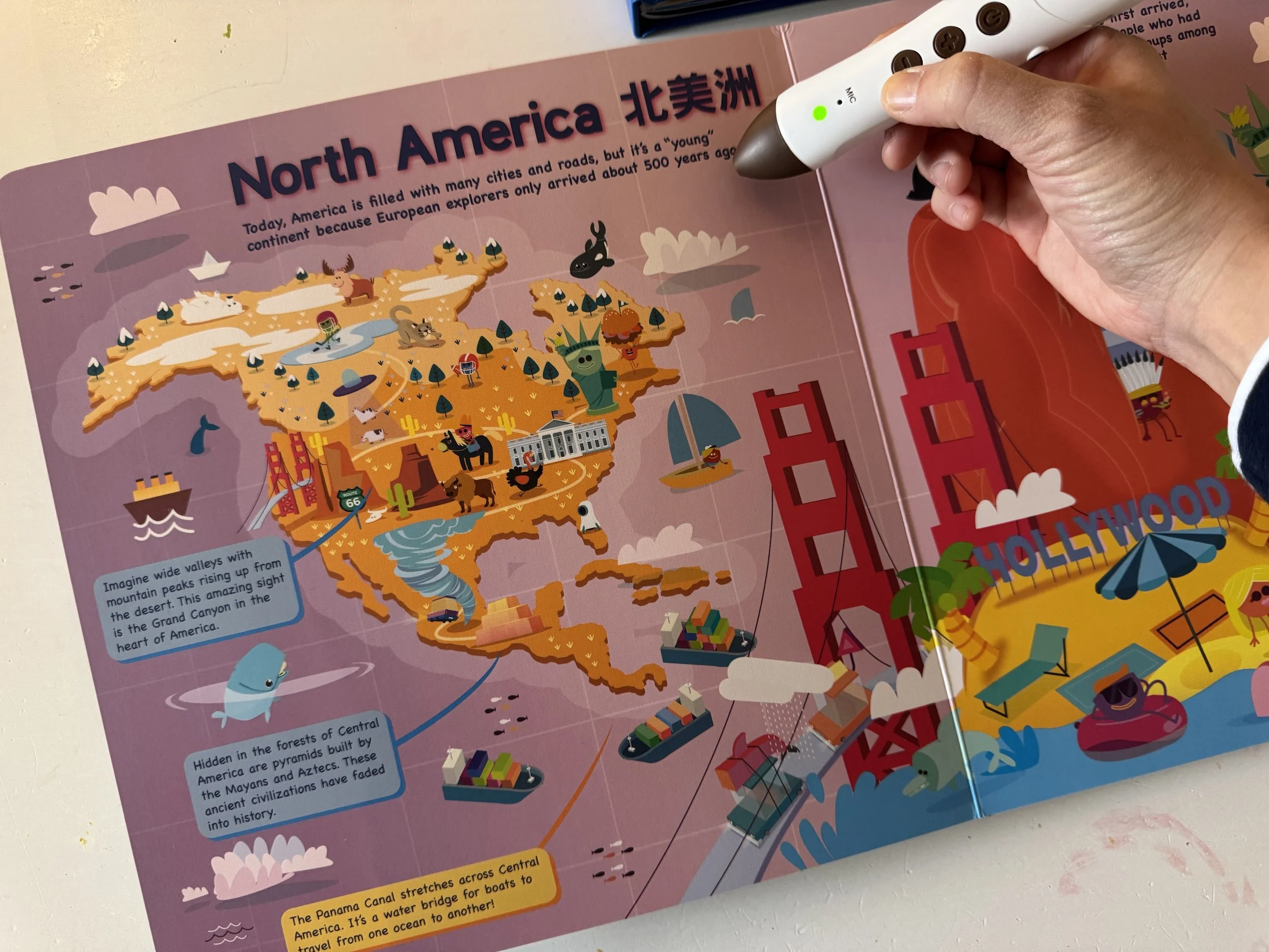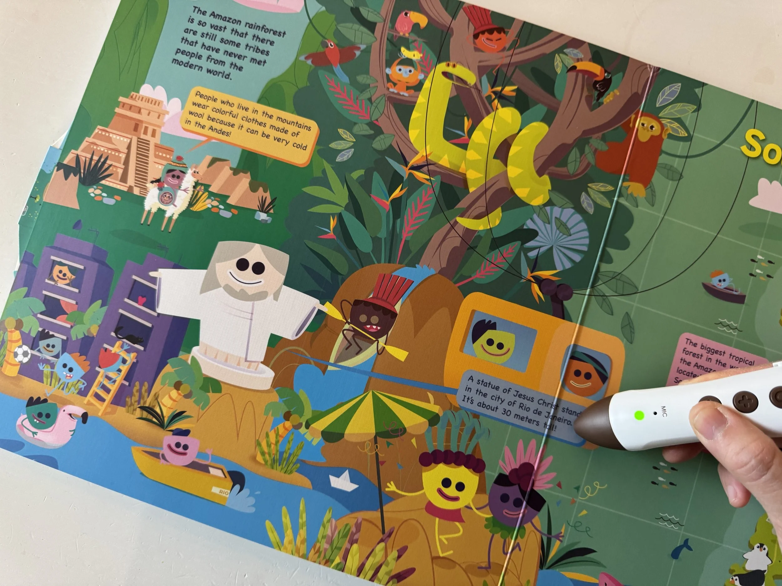 用點讀筆點選頁面上的插圖,每個小物件、 人物都有精心錄製的音效與對白喔!隨手一點都是彩蛋,有些甚至還會帶來更多關於地景地貌與氣候等延伸補充知識呢!