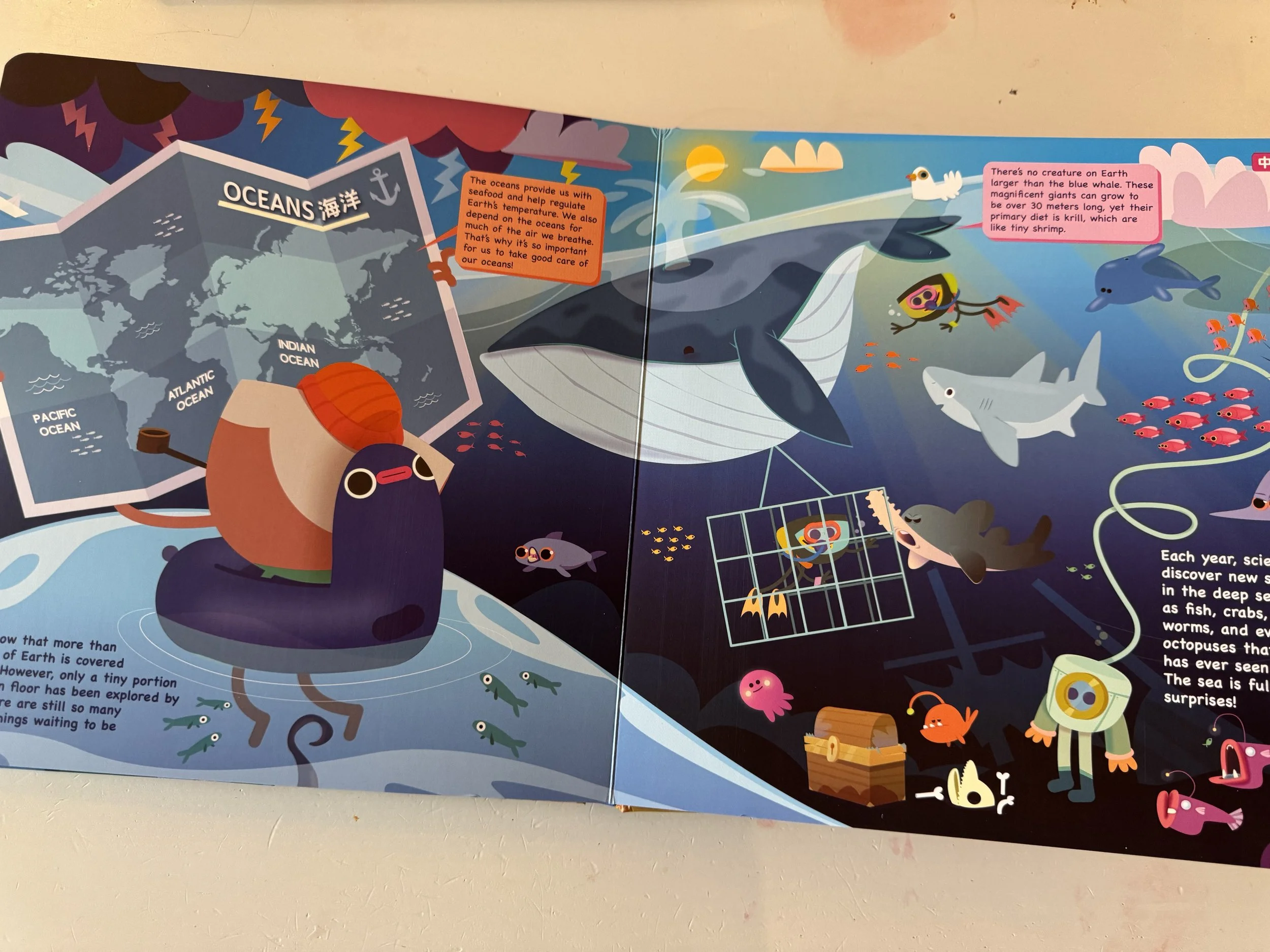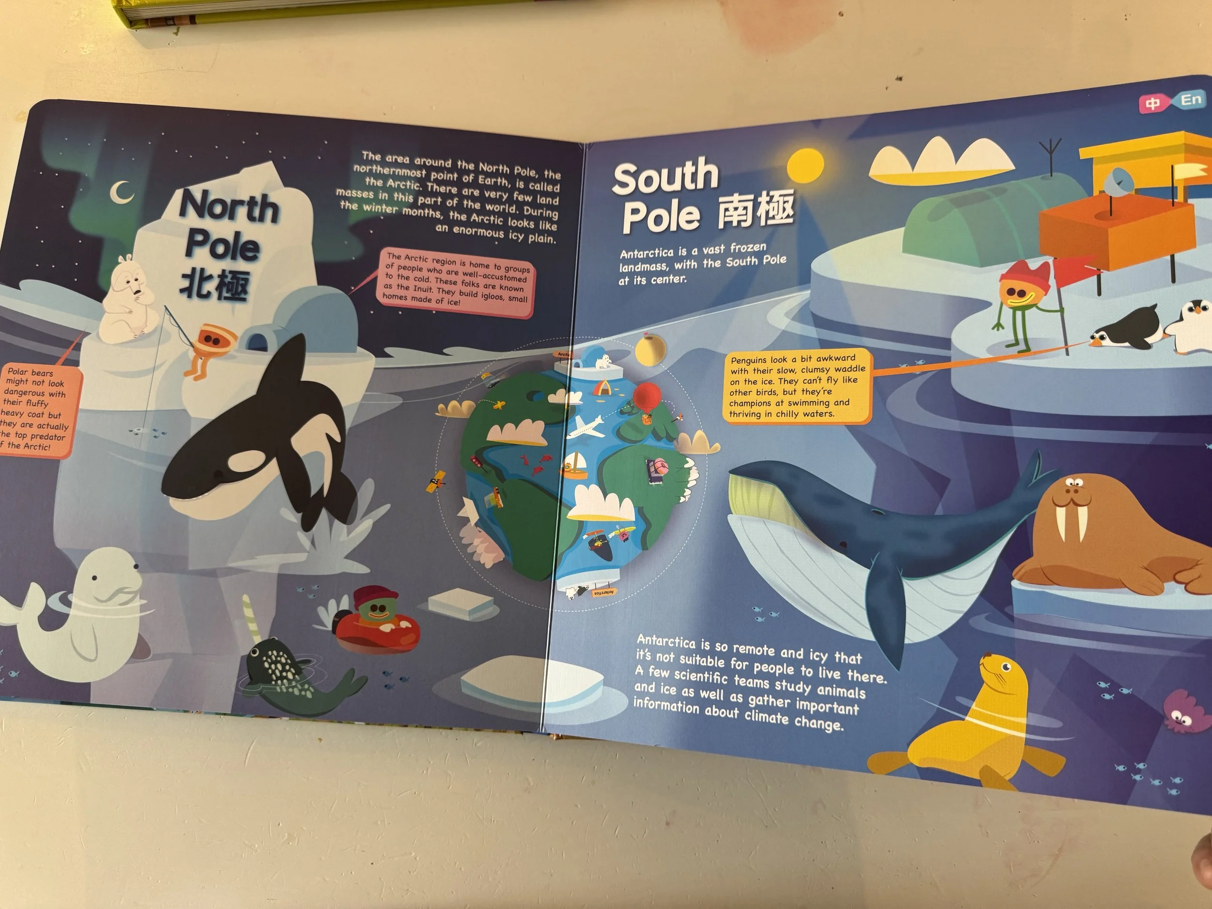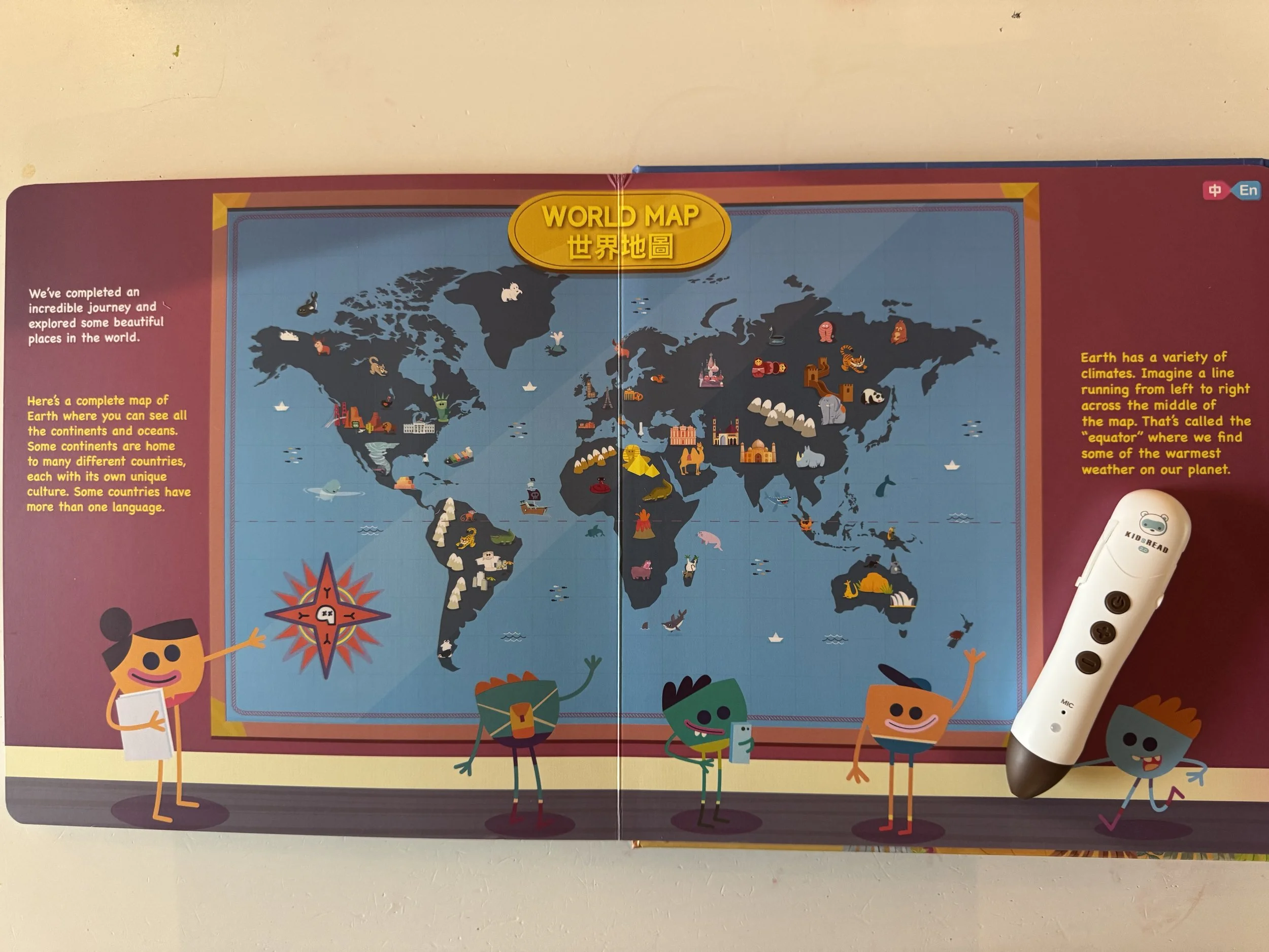 最後一頁是完整的世界地圖,我們可以看到所有大洲與海洋,每個大洲有不同的國家、使用不同語言、擁有不同文化。