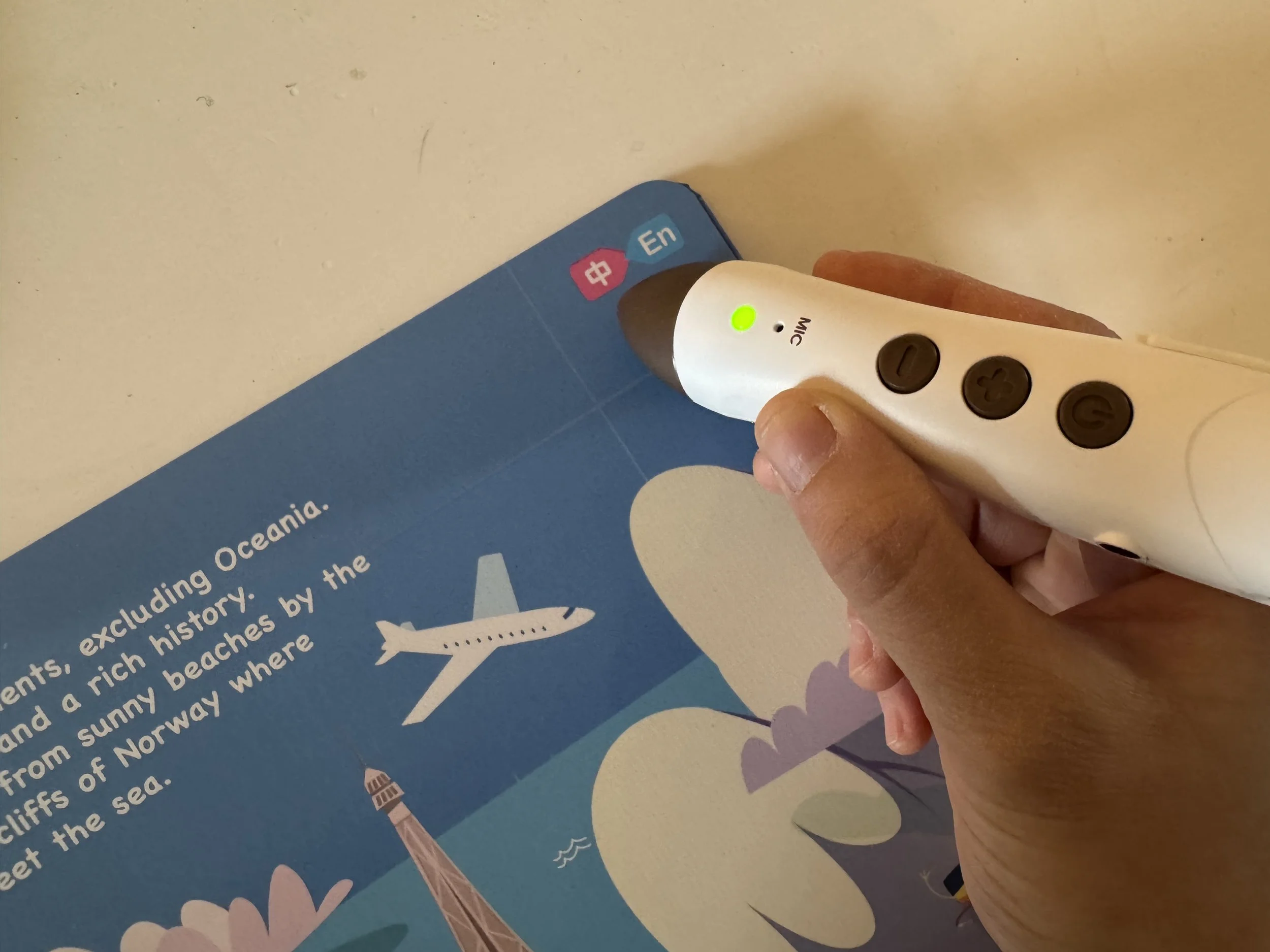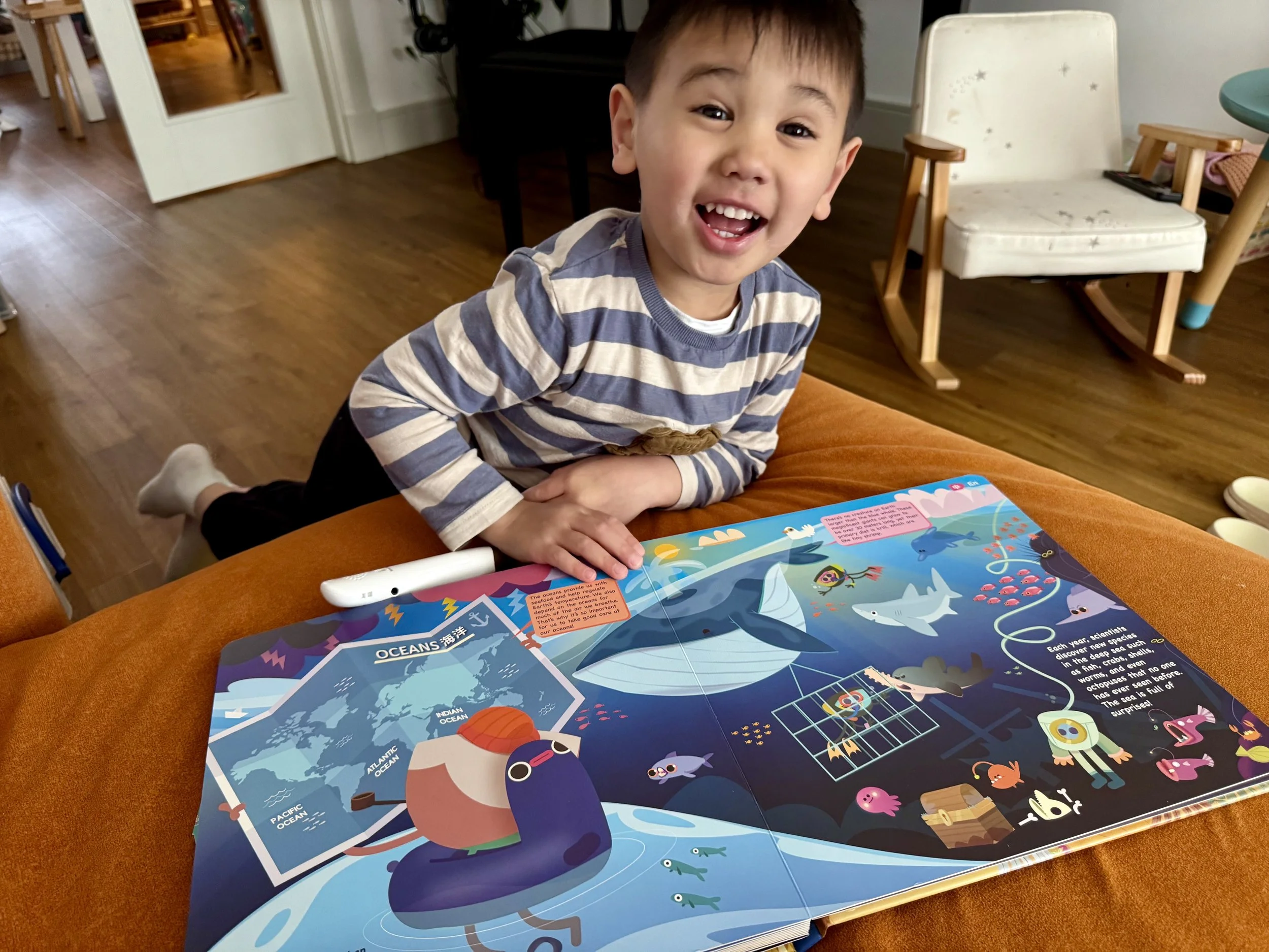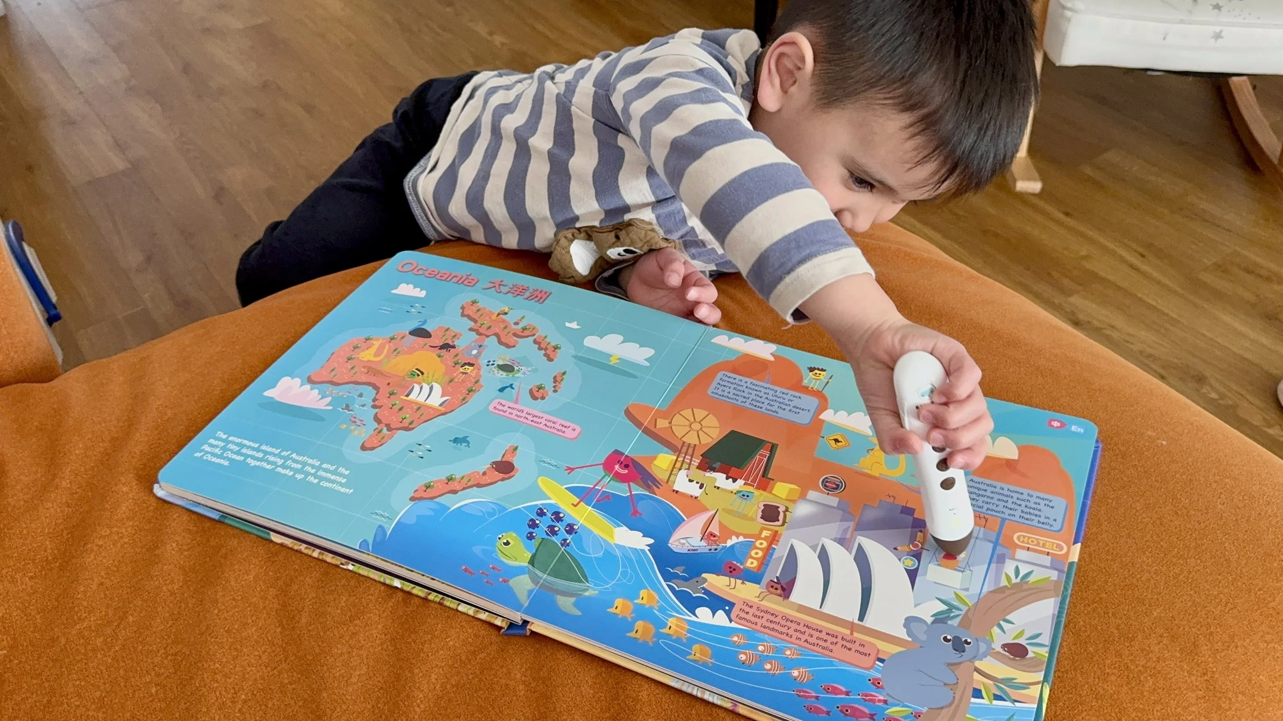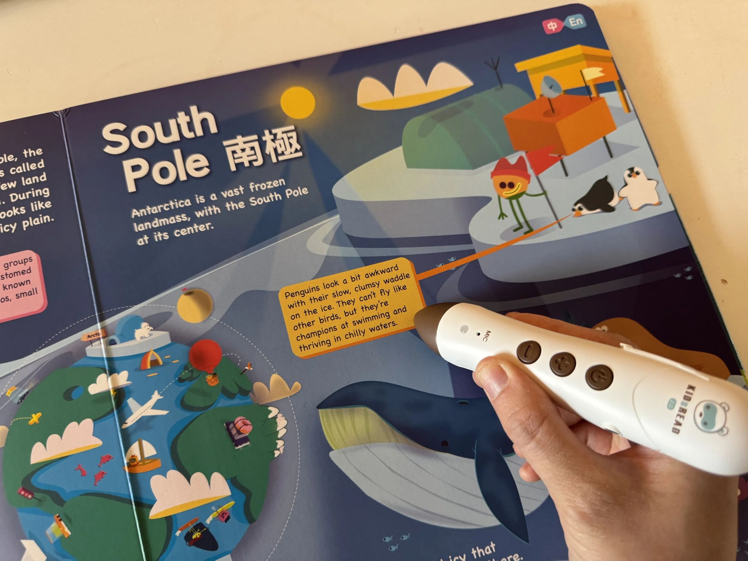 當弟弟點讀插圖、問我圖片上這個人說的話是「什麼意思」時,點右上角就能立刻切換英文,再讓弟弟現場點讀一次~即時翻譯,弟弟馬上就懂了。