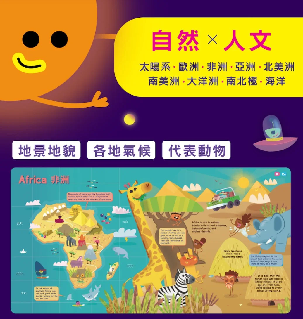 全書共有10個主題跨頁,內容涵蓋外太空到地球、五大洲到南北極 。