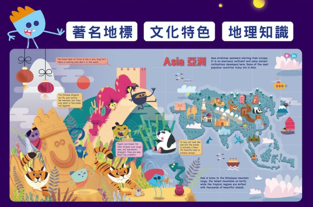 旁邊還有許多代表性的著名地標與動物的可愛插圖,透過小對話框與隱藏對白的方式,眼睛看 x 耳朵聽 x 動手找,讓小讀者們用最有趣的方式,浸潤學習到新知識。