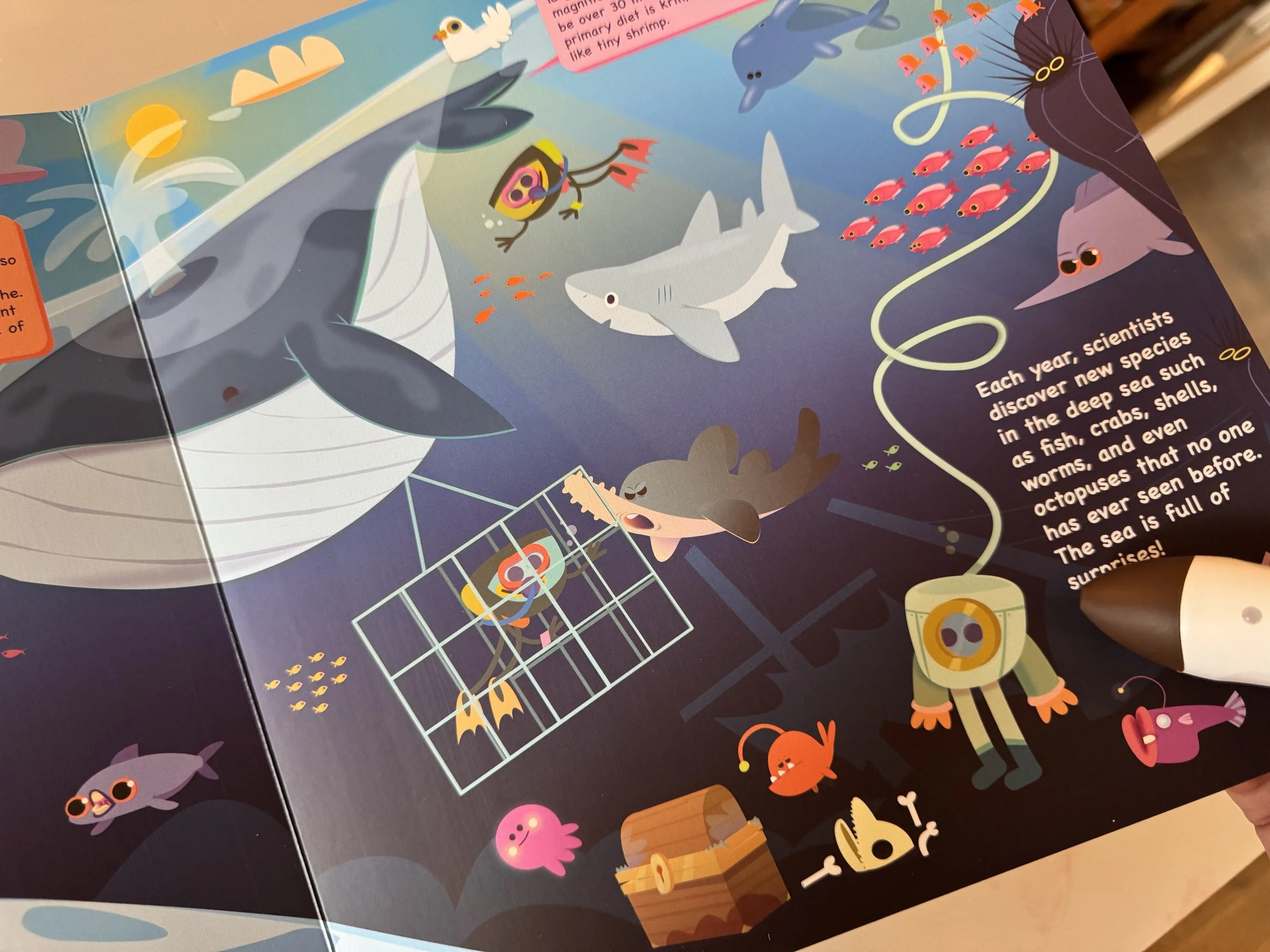 因為這頁,還特別開Youtube給孩子們看遊客躲在籠子中潛水賞鯨賞鯊的影片。