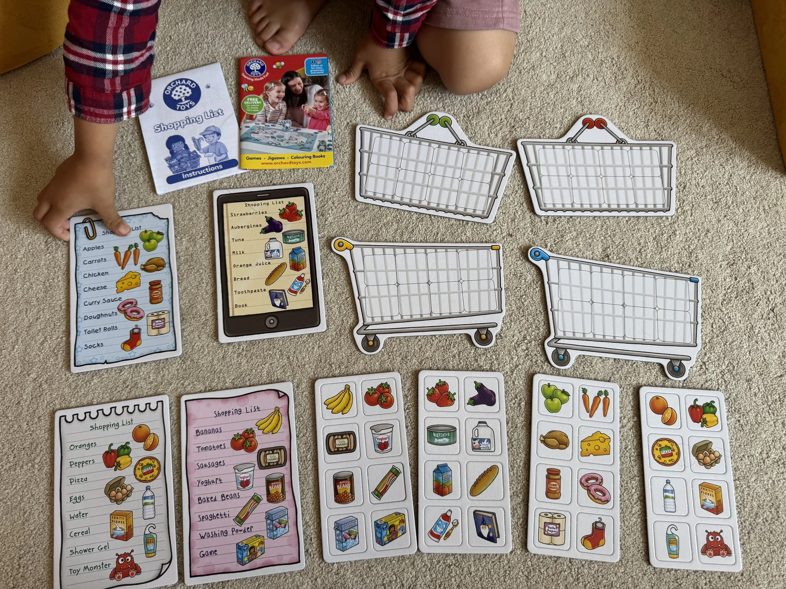 舉例來說,像經典的 Shopping List(購物清單),玩法就是大家拿著自己的購物清單,翻牌找商品,先完成清單的人獲勝。小孩會玩到哈哈大笑,因為他們彷彿真的在「逛超市」。但在這個過程中,其實孩子練習了: