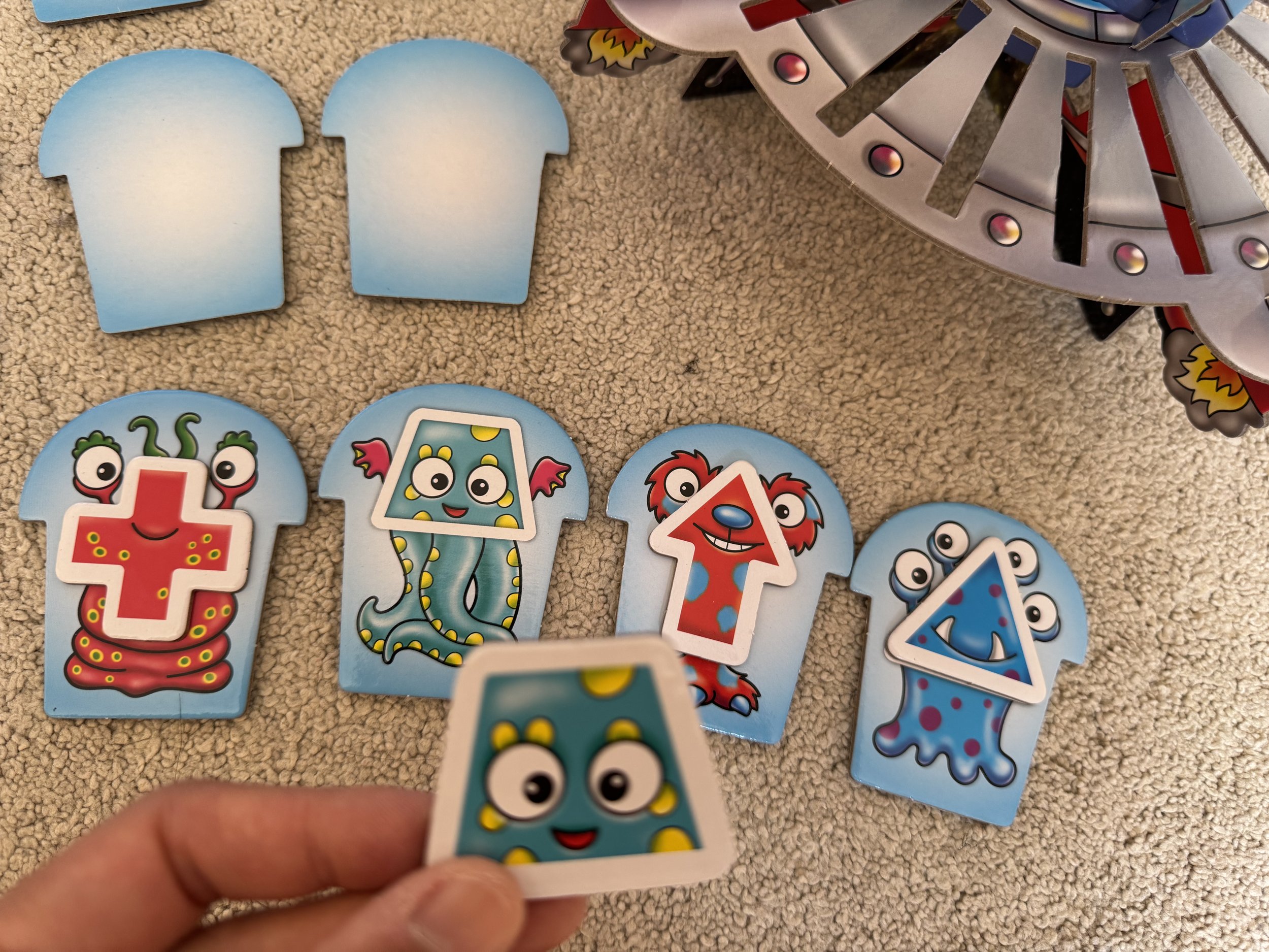 3. 玩家輪流抽卡,若形狀符合自己外星人板上的空格,就放上去;若不符合,放回抽牌堆。