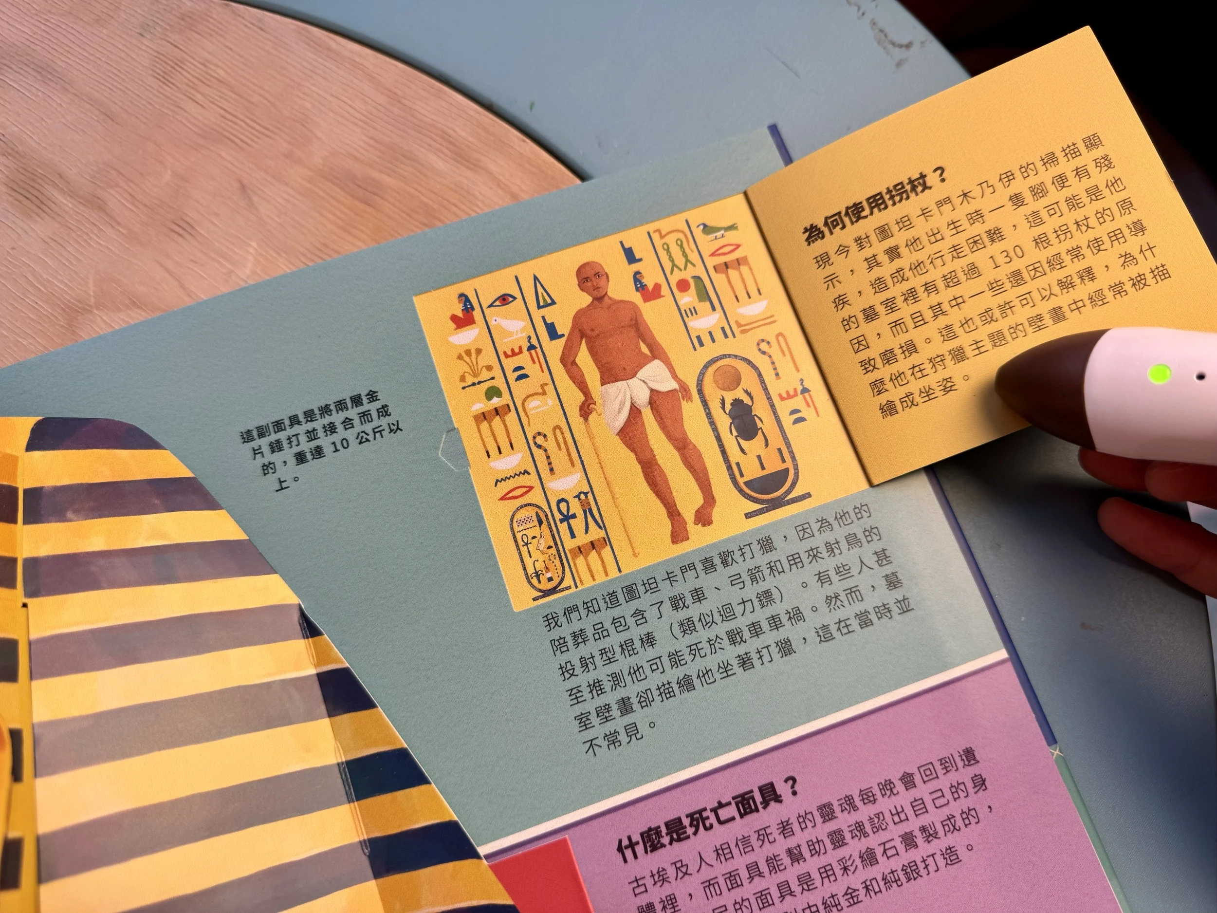 面具背面有皇家辮飾和大量的象形文字咒語,點圖片會說:「面具的背面也這麼精緻,可以看出古埃及人很重視死亡和來世。」