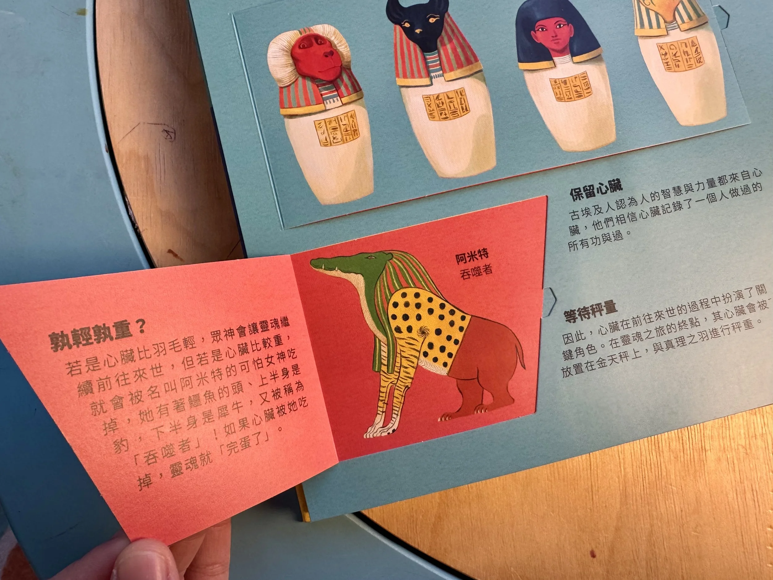 如果心臟比羽毛輕,眾神就會讓它前往來世。反之,就會被名叫阿米特的女神(鱷魚頭+豹上身+犀牛下半身)吃掉,也就是吞噬者。