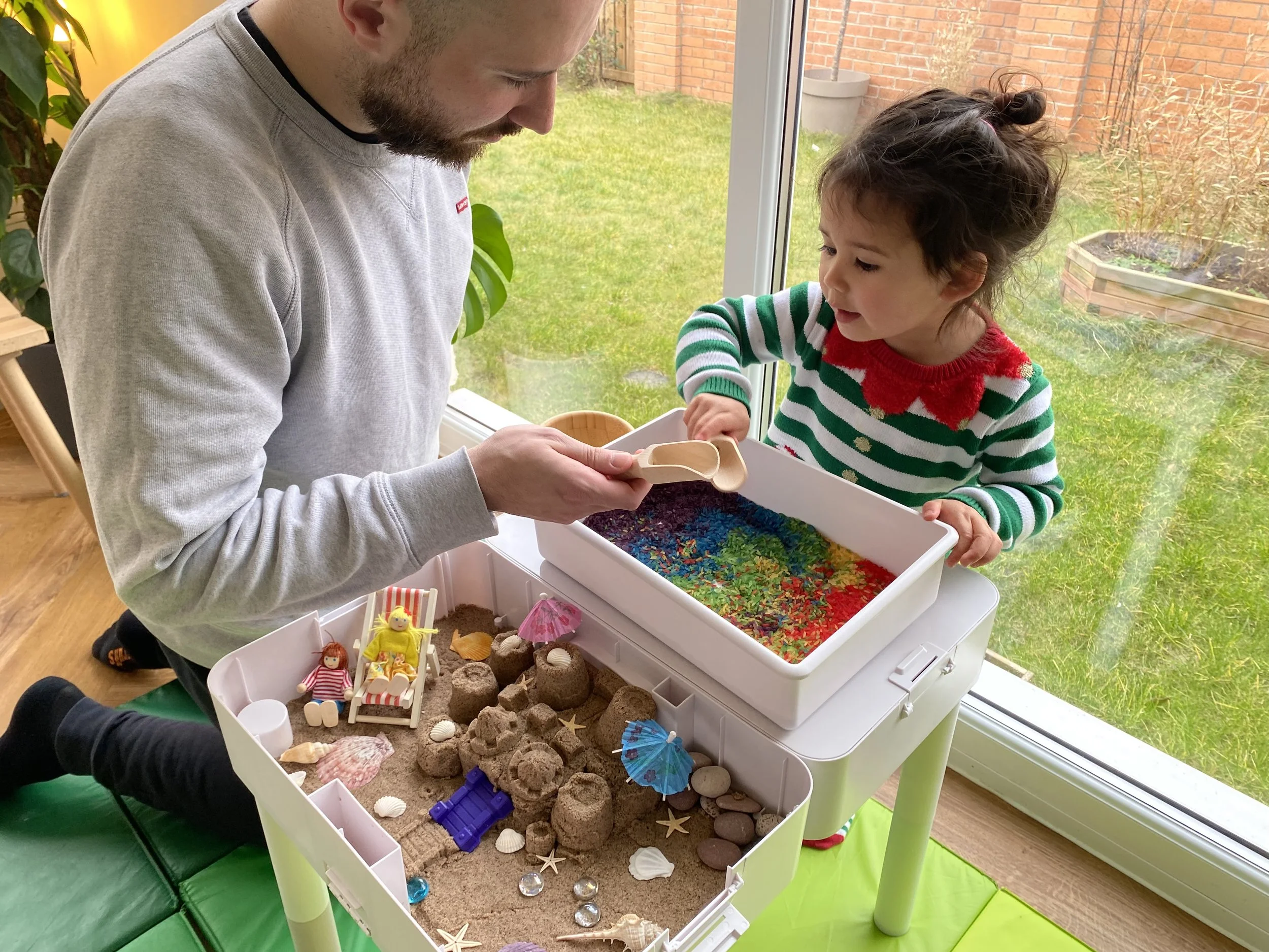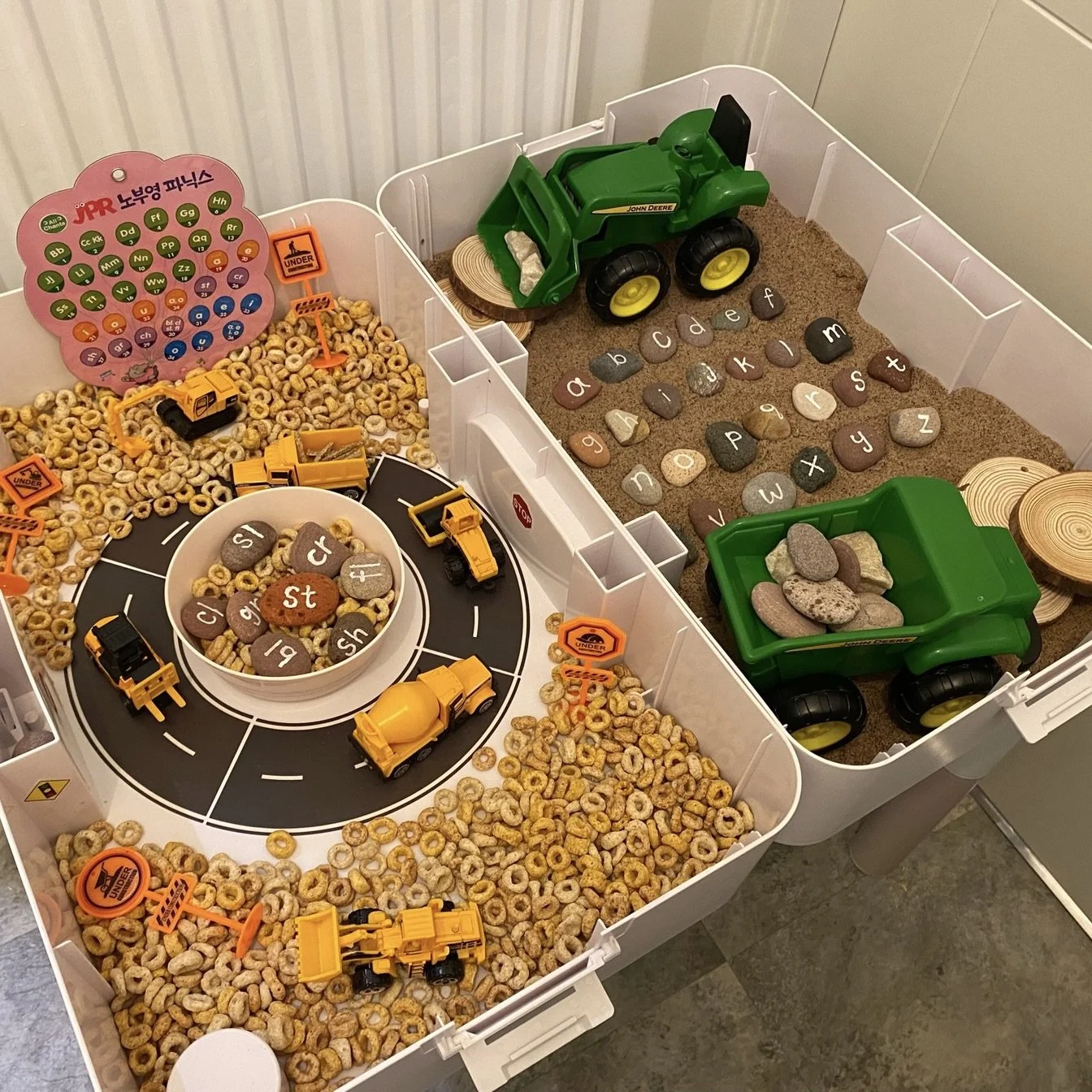 除此之外,它還有孩子最愛感官桌的雙凹槽設計,簡單放進各種沙、豆豆、和五感素材,就可以讓孩子開心好久。