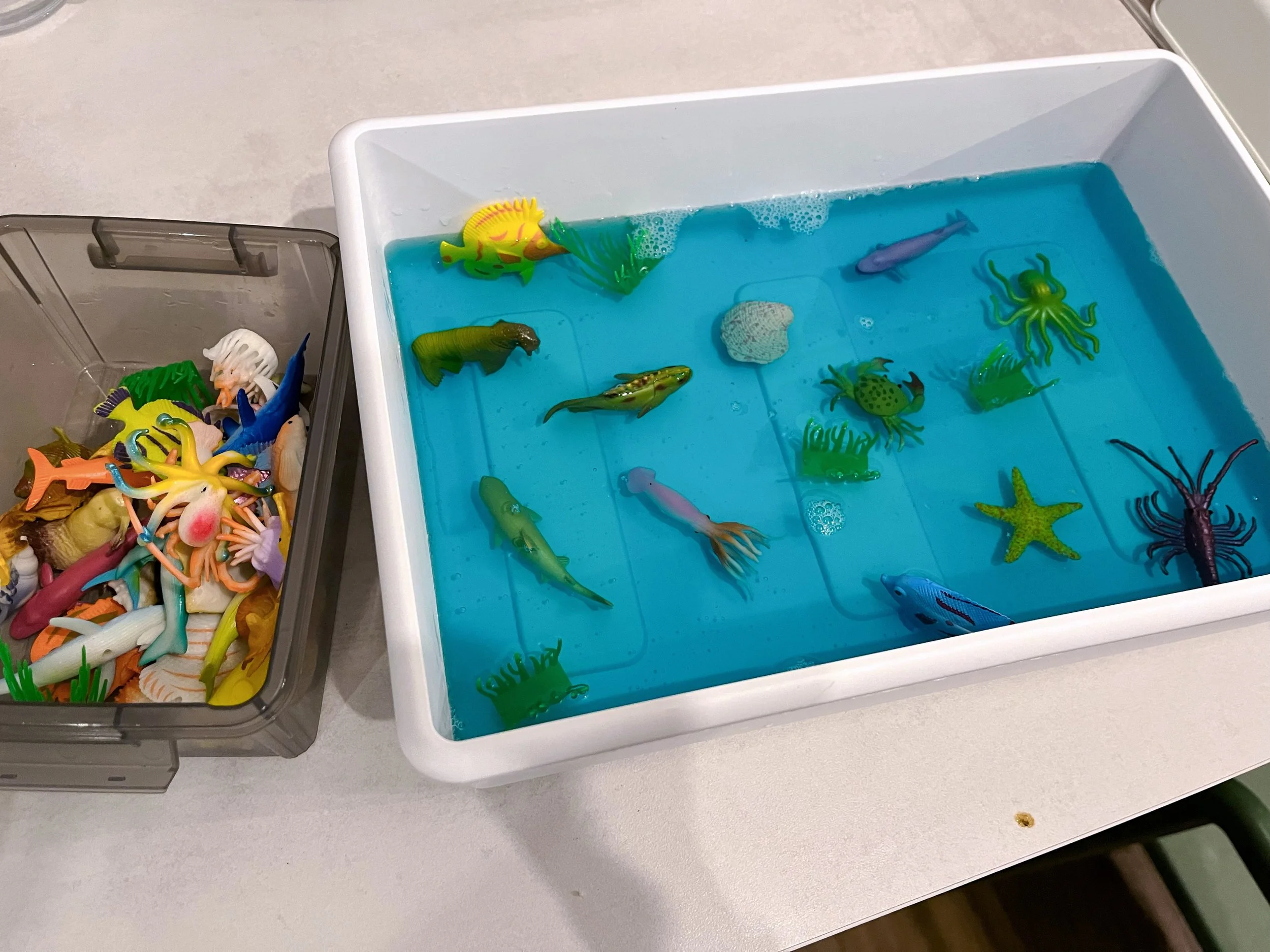 想不到該玩什麼的時候,就可以丟出釣魚遊戲,小朋友自己會在水盆前站一整天(笑)