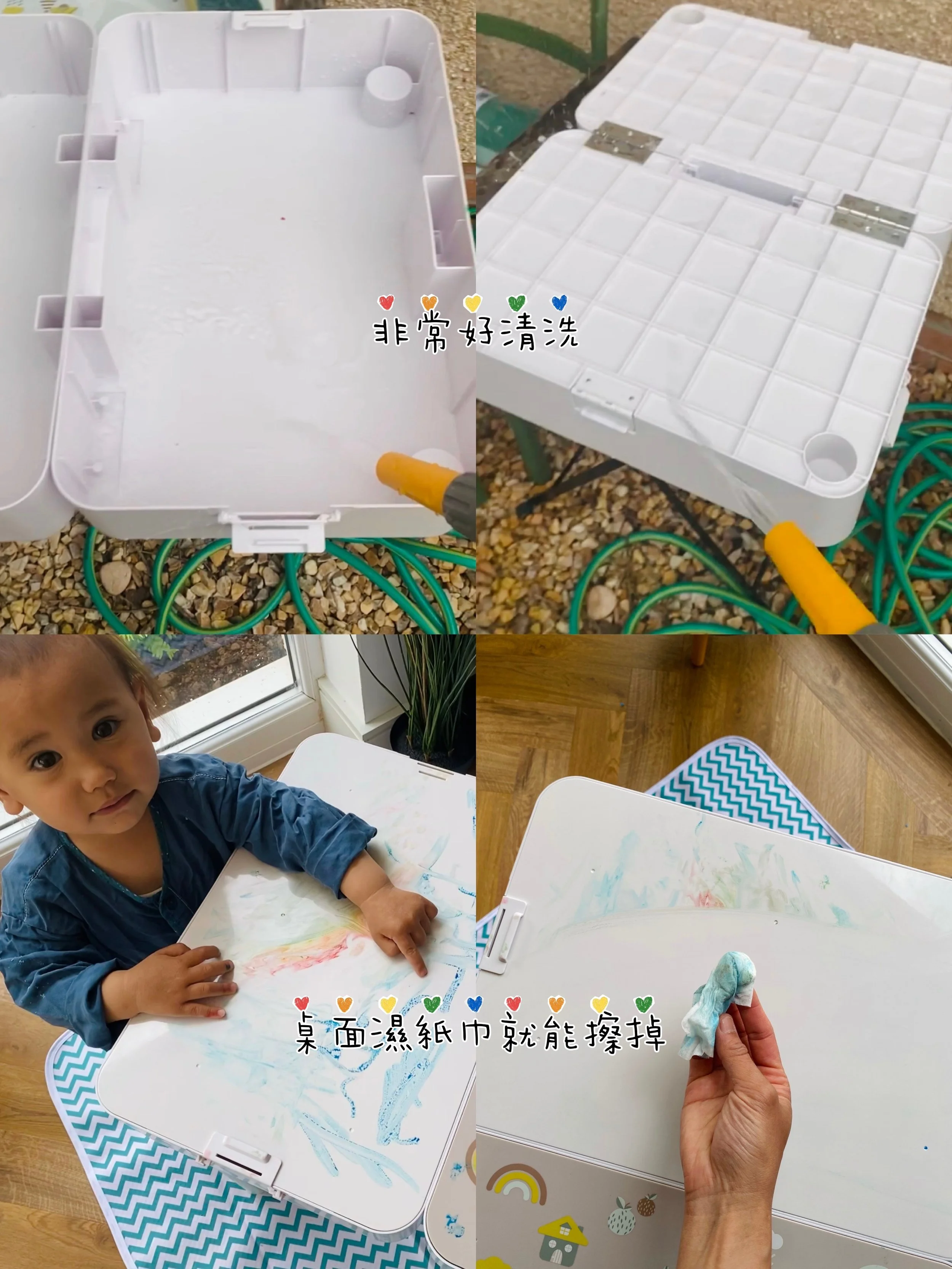 桌板立起就能變畫架,凹槽放置顏料不怕打撒,媽媽不用當跪婦。桌面好清潔,濕紙巾輕輕一揮就乾淨溜溜。