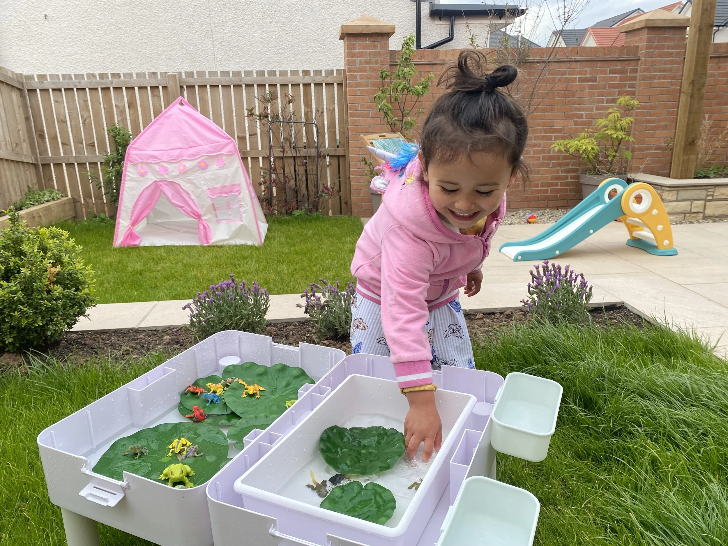 天氣好的時候,搬到露台或是花園,又可以有更多玩法。圖片為孩子學習蝌蚪到青蛙的生態循環。
