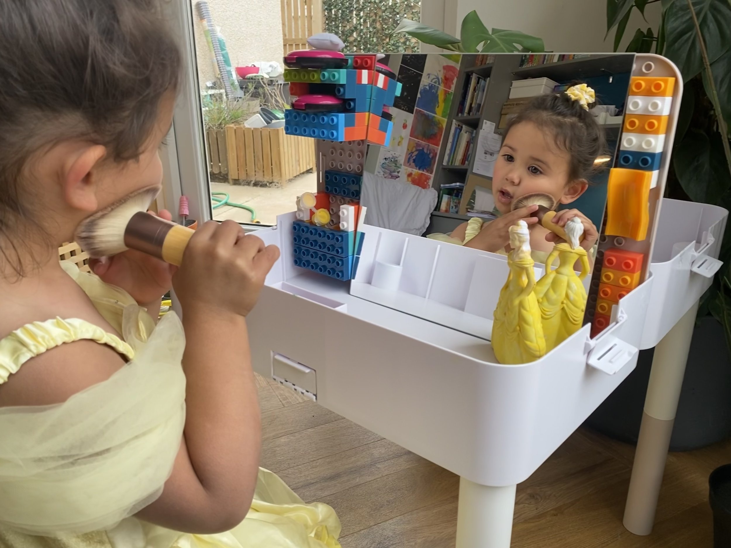 同時它也是樂高/ 德寶桌,大小顆粒各一面,就藏在桌板的背面,翻過來就可以開始忙碌。女兒小時候會幫自己做一個梳妝台,在這邊學起媽媽化妝的樣子,超級可愛。
