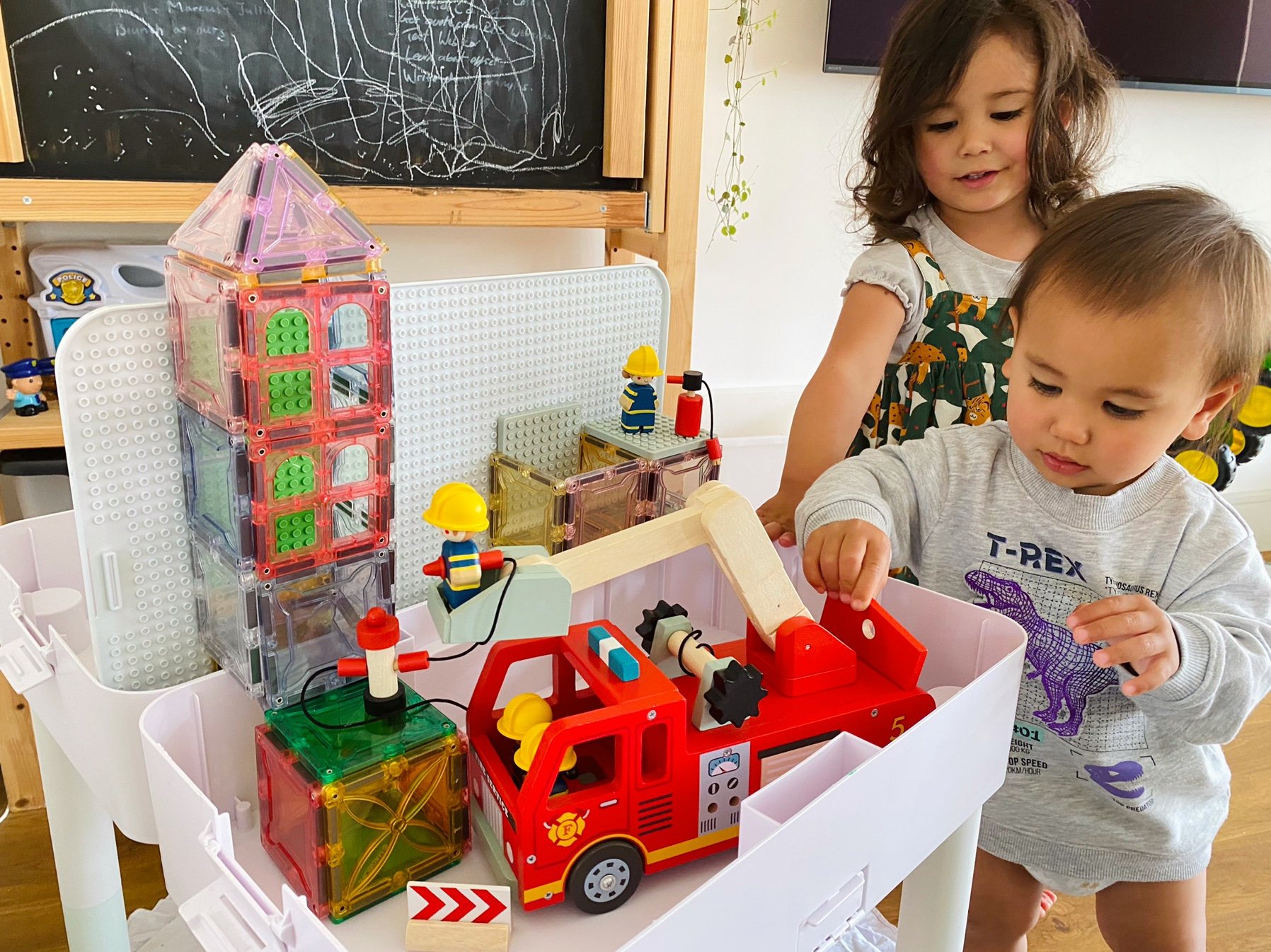 樂高版豎起來,就可以搭配 Magblox的樂高相容積木磁力片一起玩。這天雙寶在玩消防車救援隊。