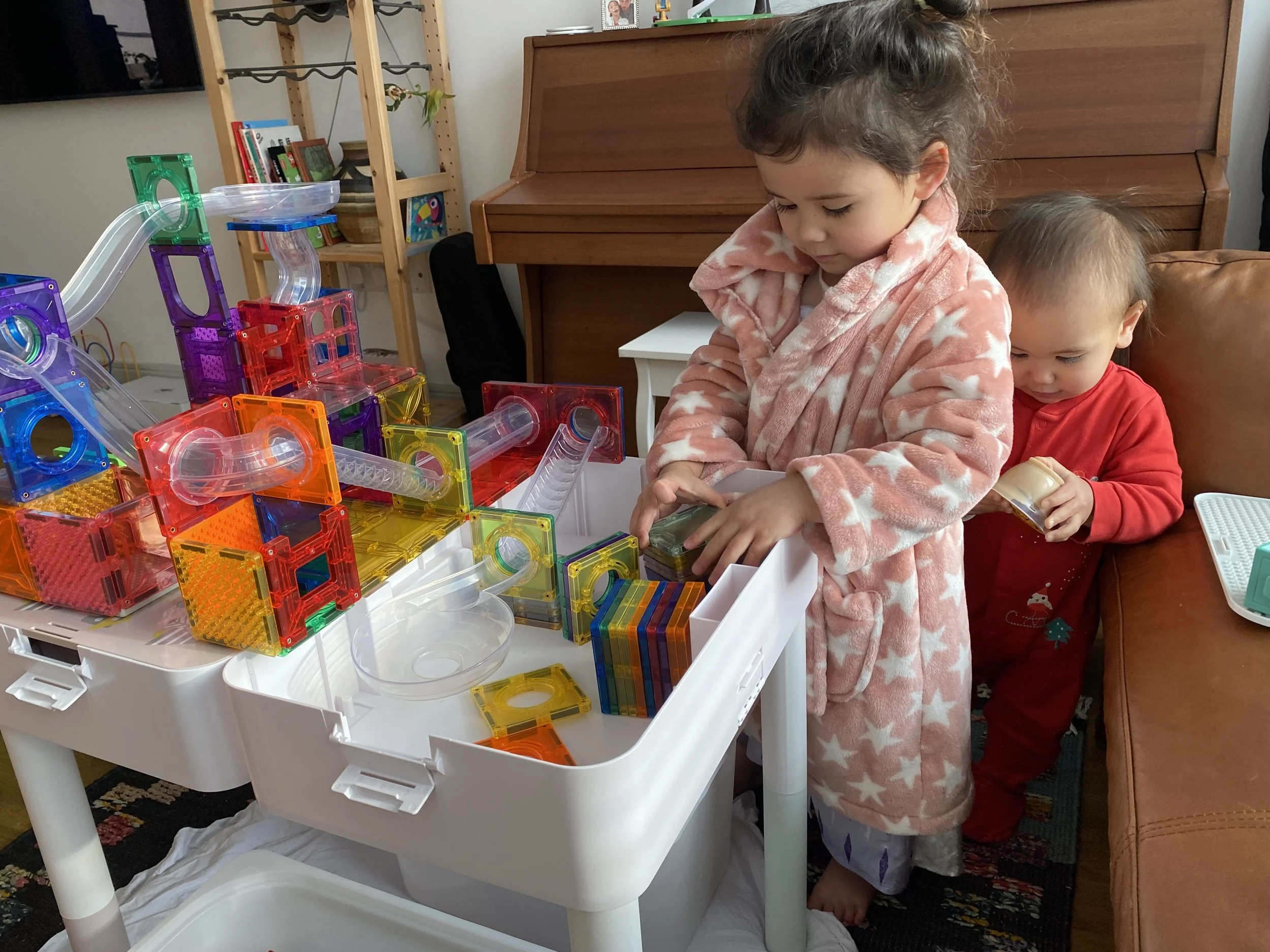 原本妹妹是要去搗蛋哥哥的磁力片球道,被哥哥溫柔引導對面去玩透光積木。