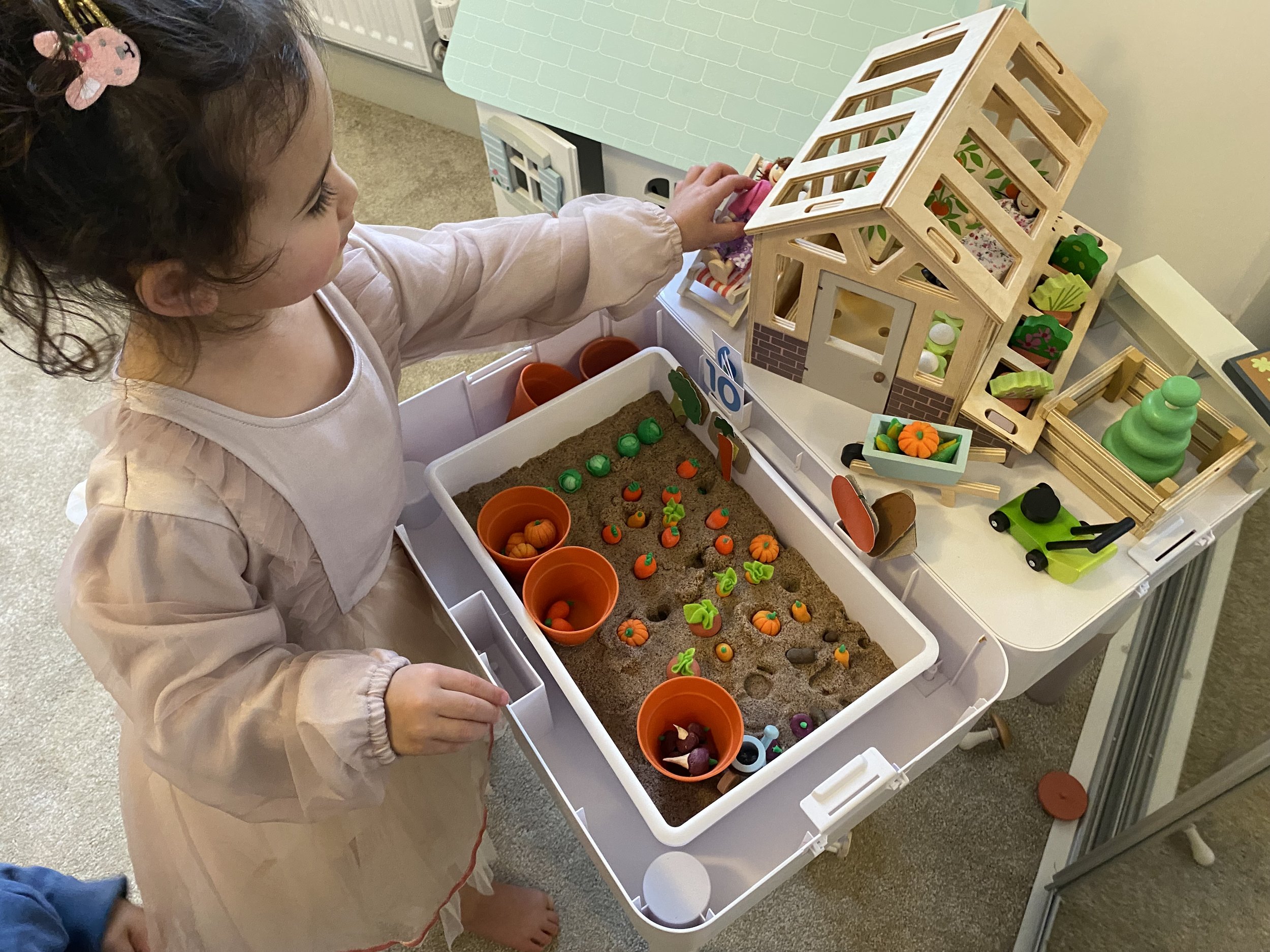 我跟孩子們一起做的培樂多黏土花園,風乾後就可以開始開心農場的種菜遊戲。