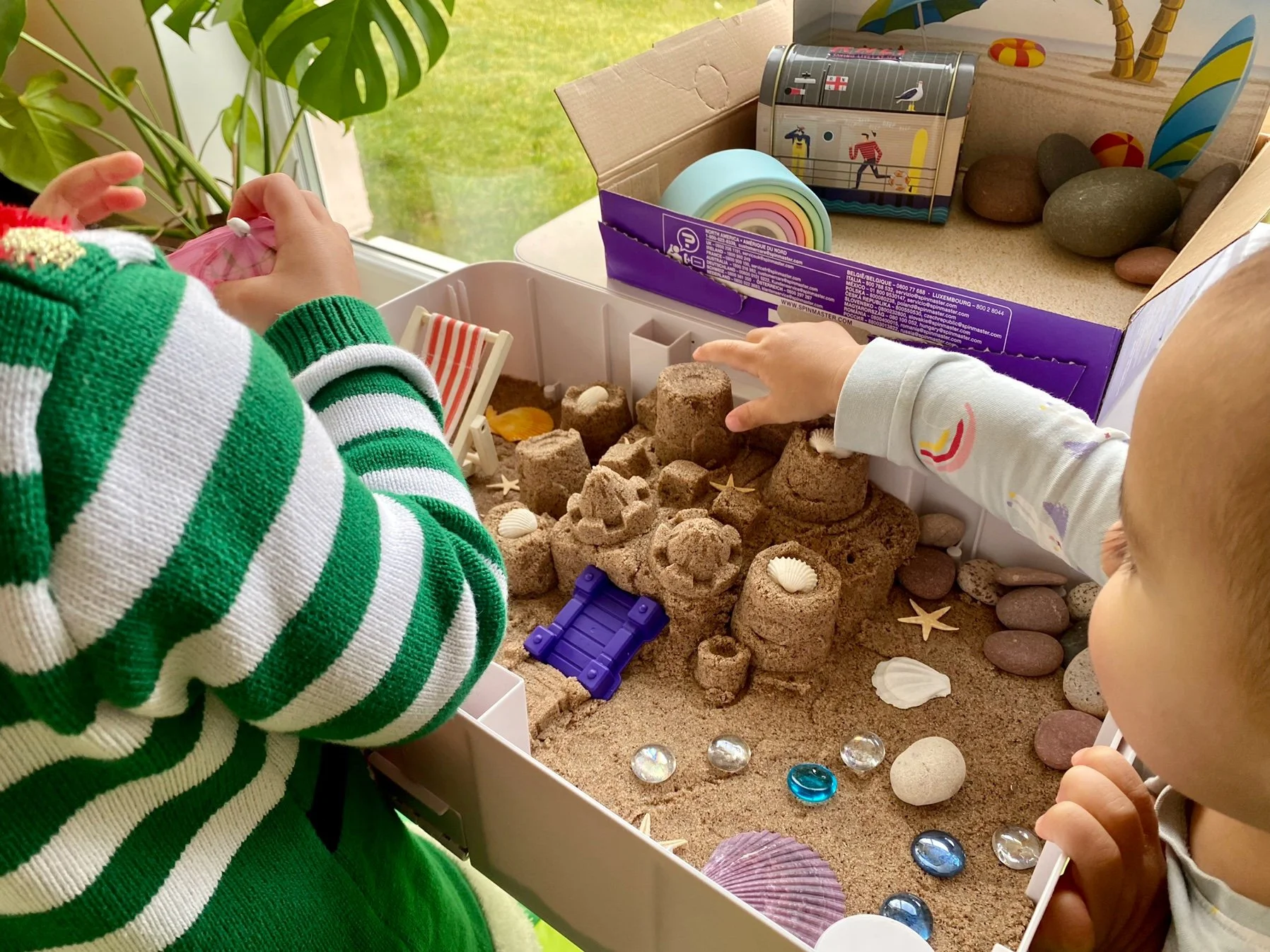 不用到海邊,就可以變出小沙灘!動力沙或是太空沙都很棒,過了口慾期的寶寶都可以玩。
