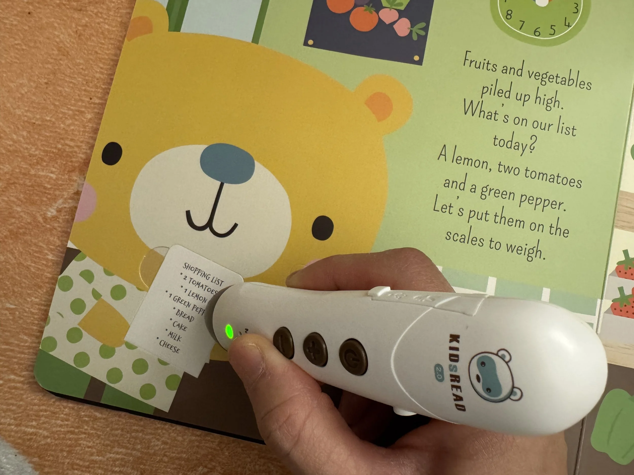 會告訴小朋友今天要買的東西,有蕃茄、檸檬…等等,跟故事內容相呼應。