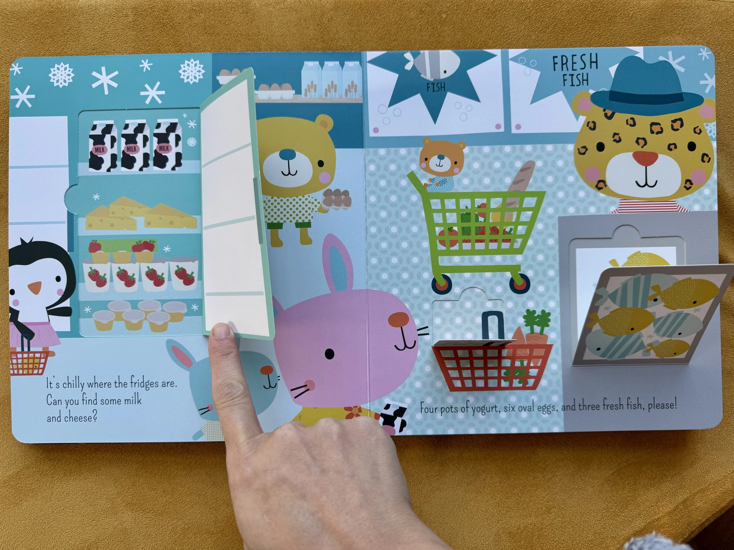 翻開左側的頁面,小熊從貨架上拿下了蜂蜜和穀物麥片;翻開右側的頁面,小鴨子不小心把疊得高高的穀片盒弄翻,穀片都灑了一地。