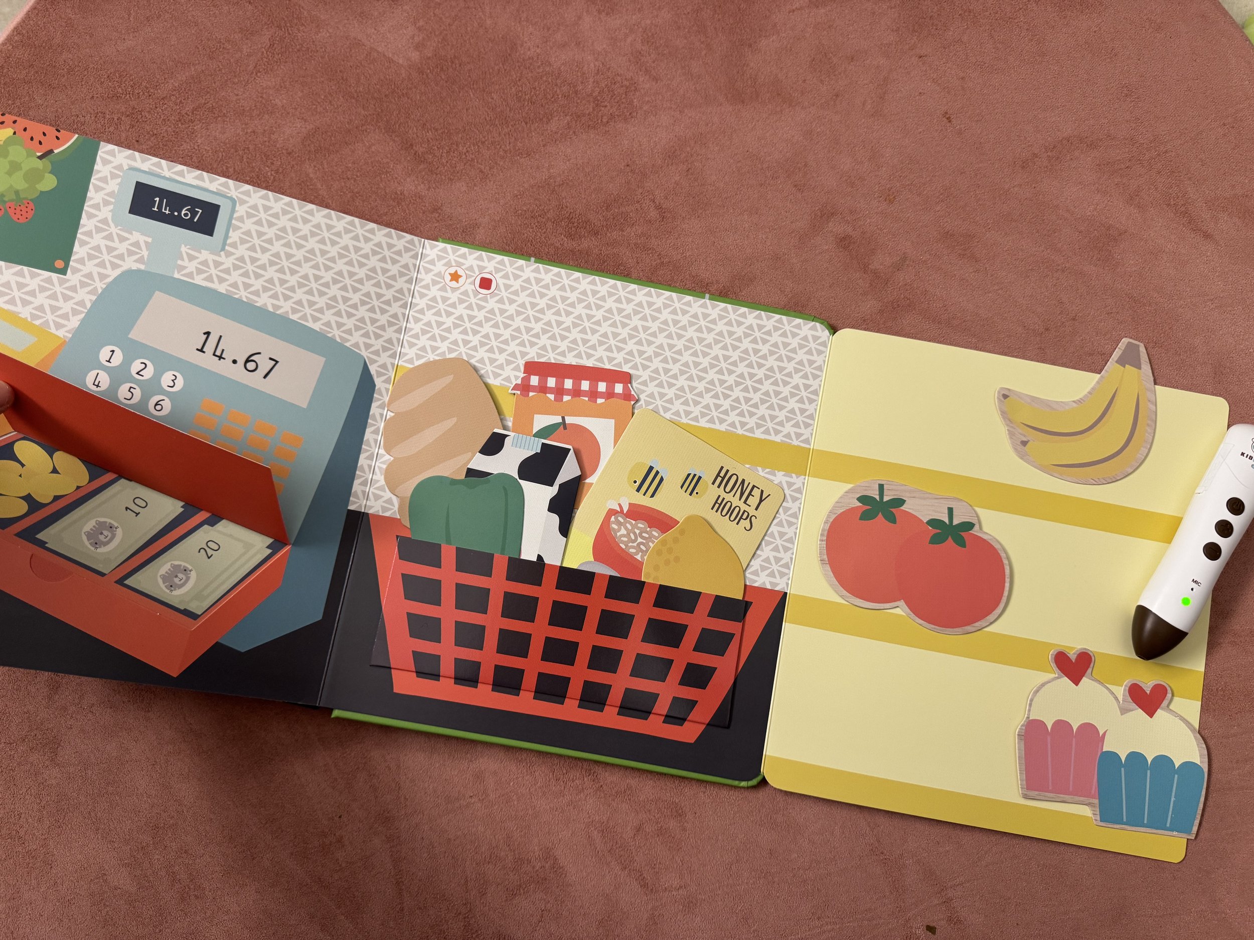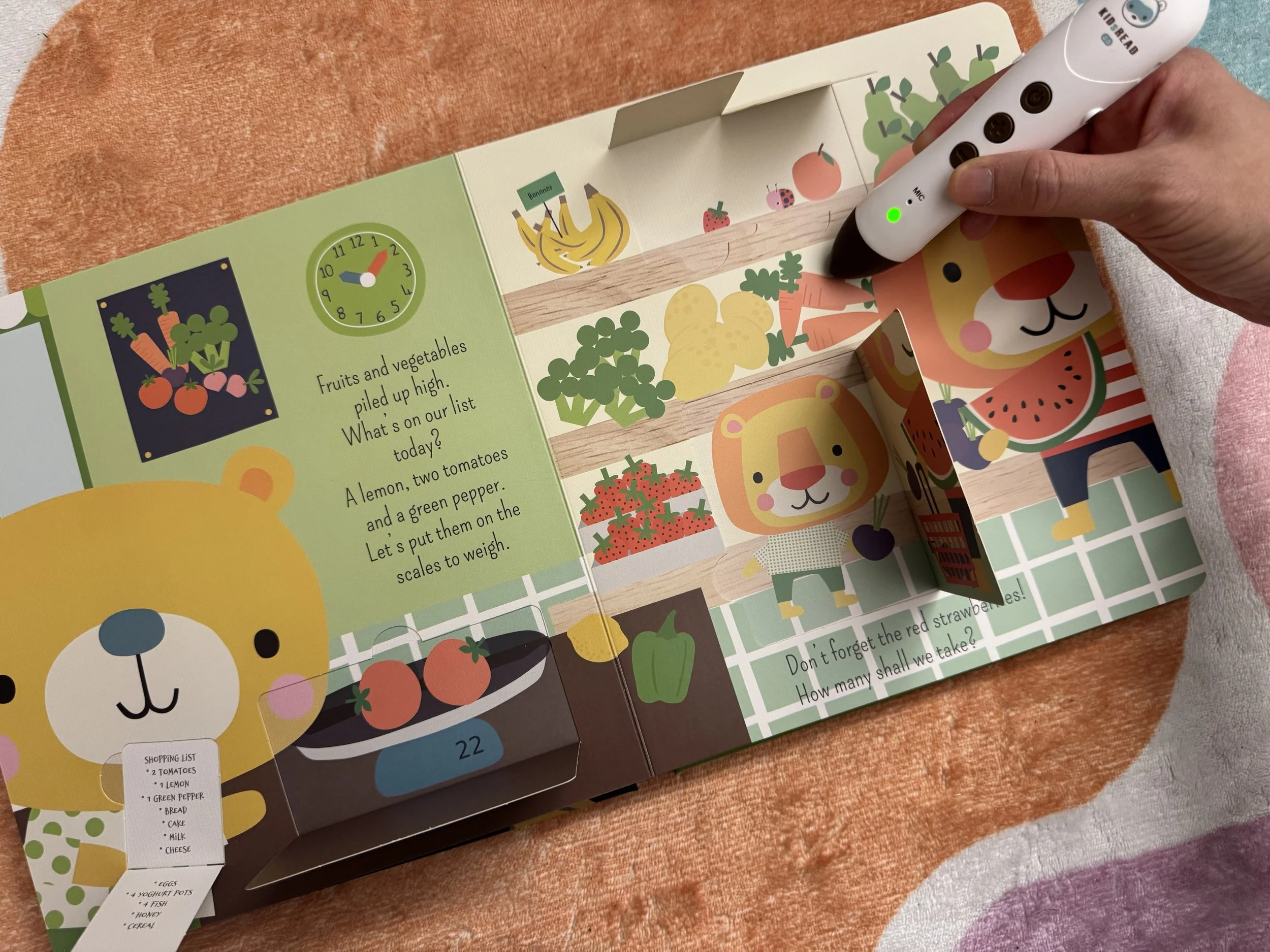 在超級市場這本書的遊戲頁,點讀筆會帶著孩子們到超市購物,找出要準備的早餐、午餐要做沙拉的食材等等,透過高互動的玩中學與仔細聆聽,提升孩子的英語力。