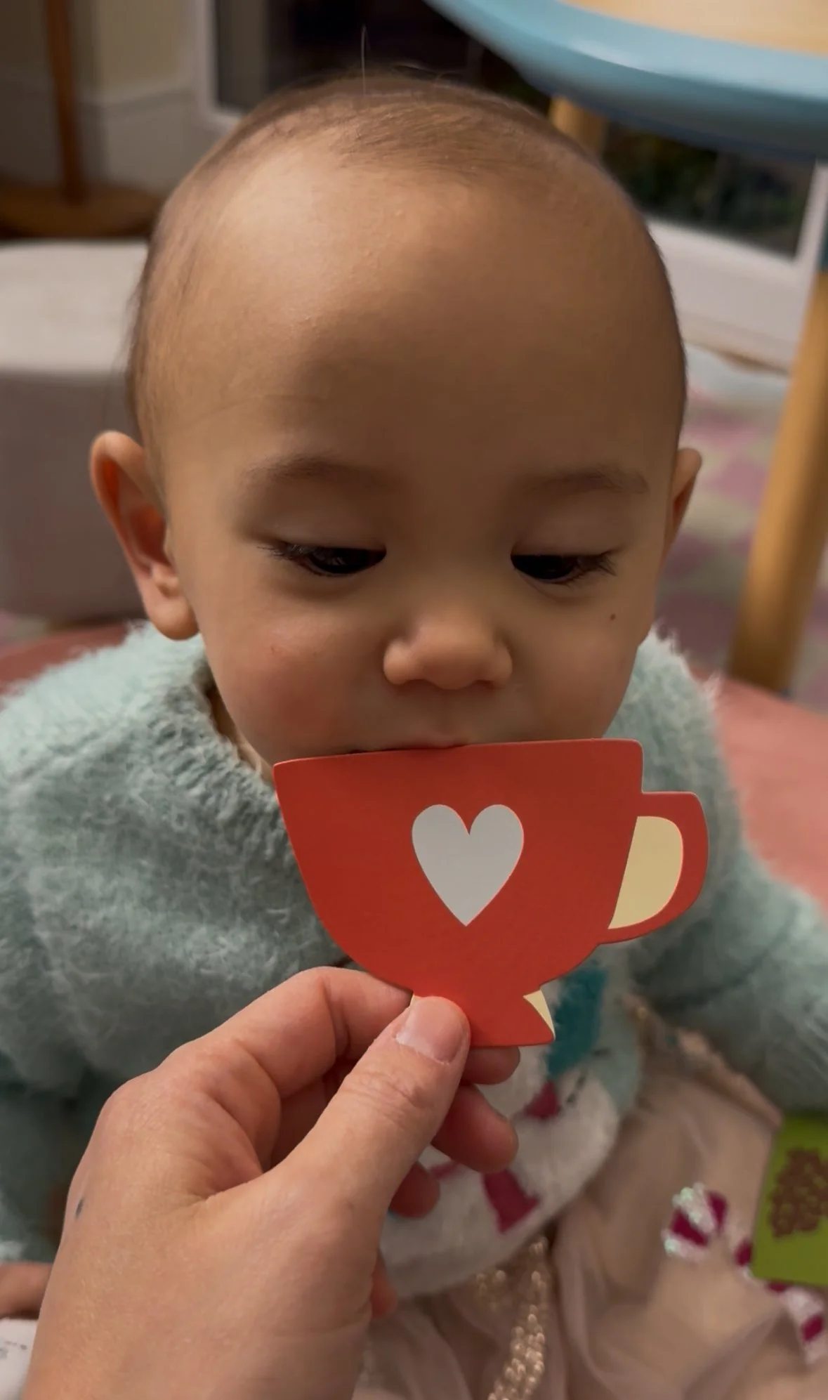 如今寶寶也很愛演,喜歡跟媽咪拿教具小杯子玩乾杯遊戲。