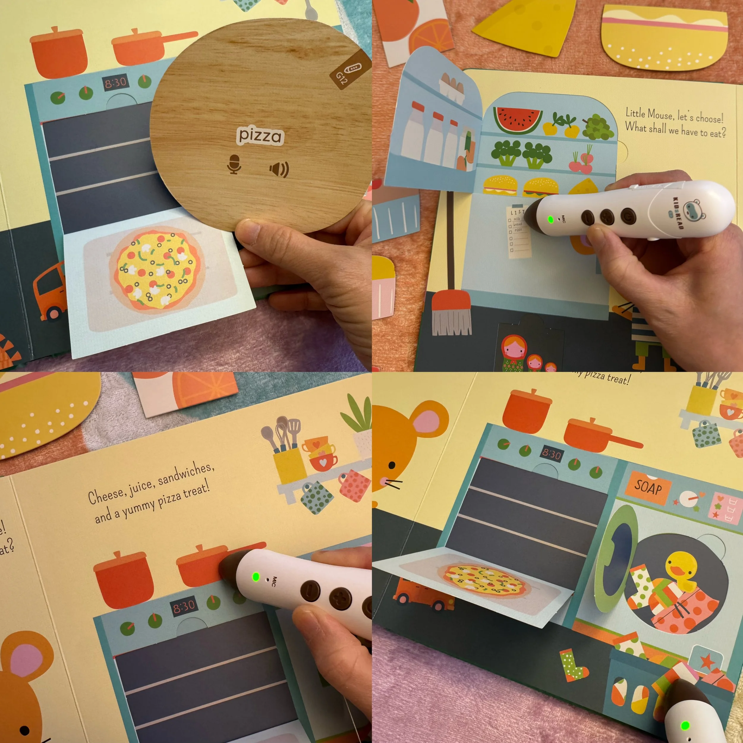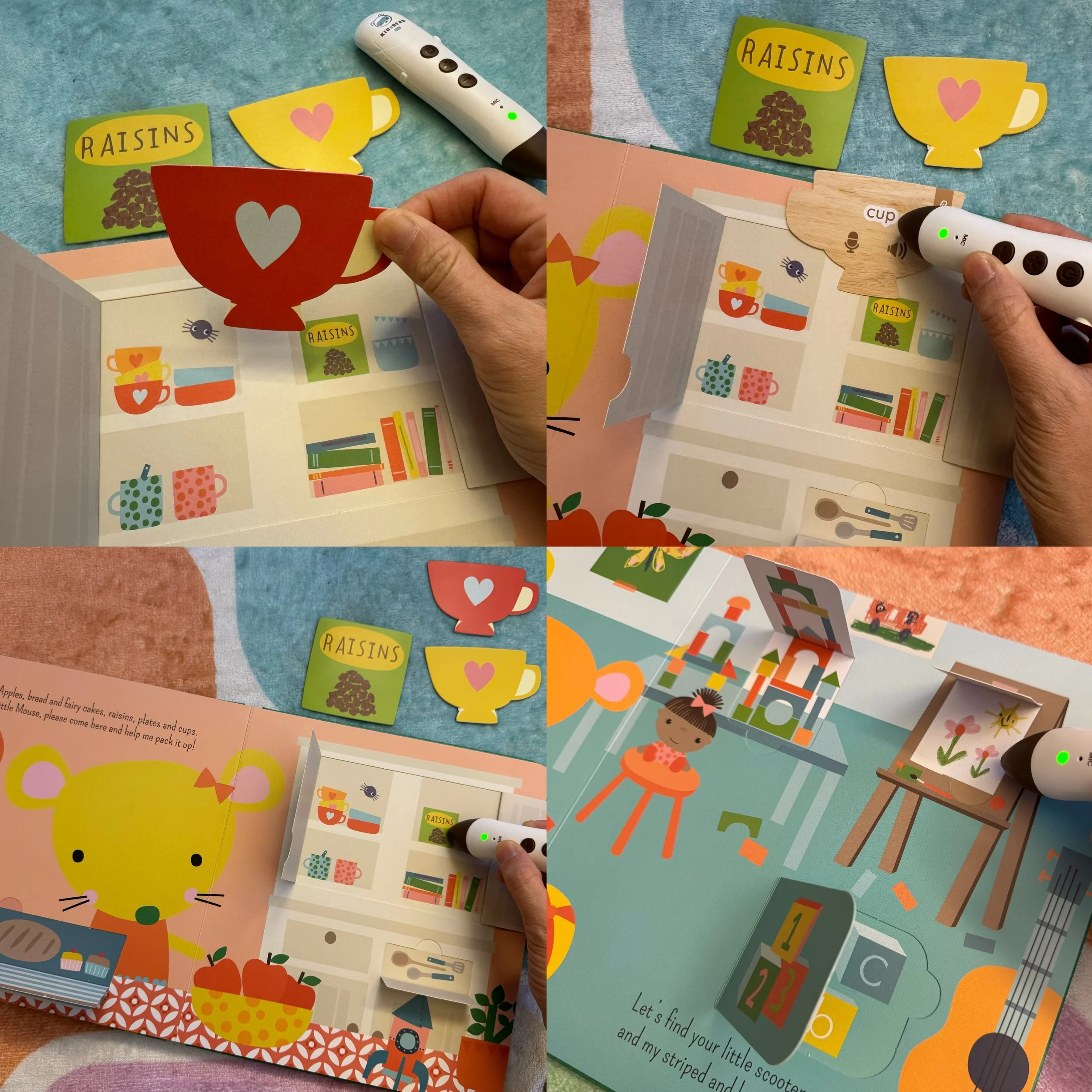 每本書包括超過15種互動小配件,這些配件均具備英文點讀功能,搭配每頁的情境可進行角色扮演遊戲,透過圖像認知輕鬆學習這些物品的英文單詞。