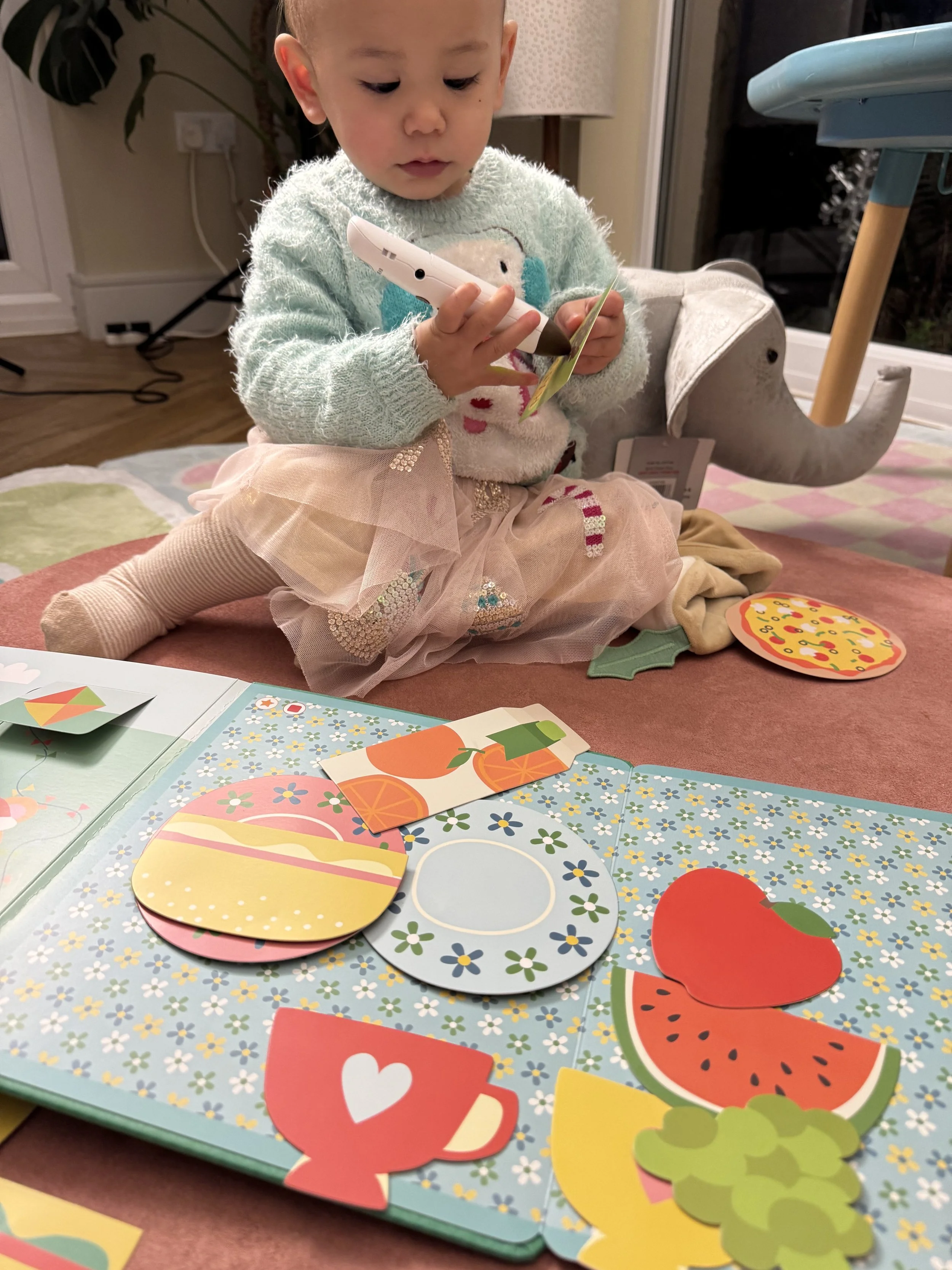 而這套書中附贈的厚紙教具比我自製的強多了,耐操且多元完整。且每個小物件都可以用點讀筆點來聽,正在學英文的孩子在玩中學的過程中,一定可以無痛又不知不覺通通記起。