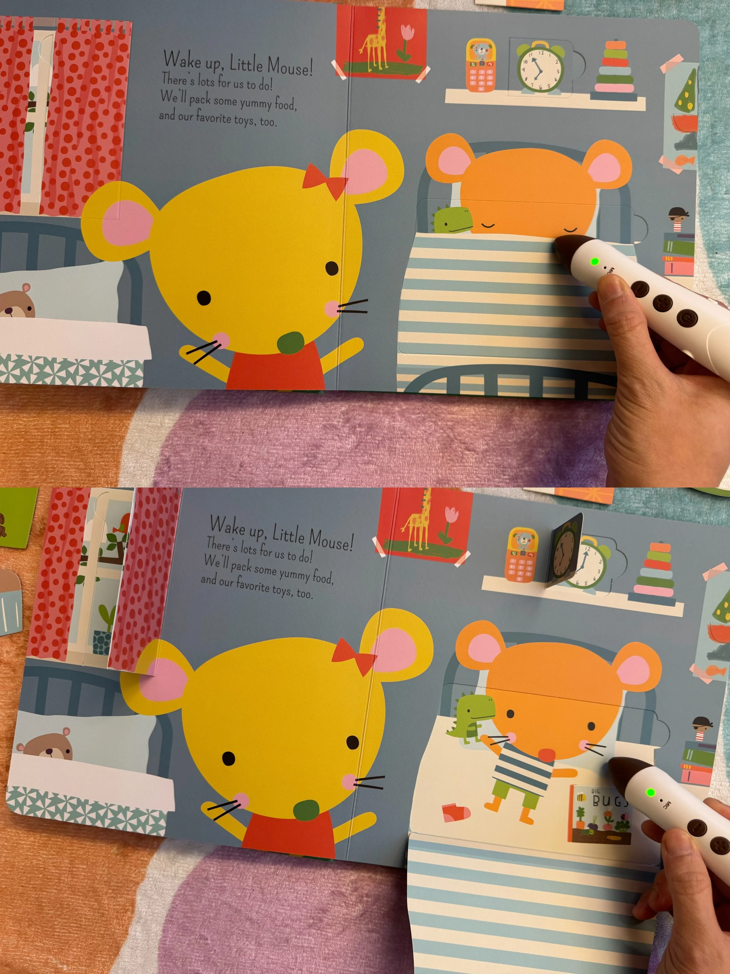 掀開小老鼠的棉被,沉睡的小老鼠會睜開眼睛,床上有恐龍玩偶、昆蟲主題的故事書和一隻襪子;掀開鬧鐘的小翻頁,時間會從6:55變成7:00。
