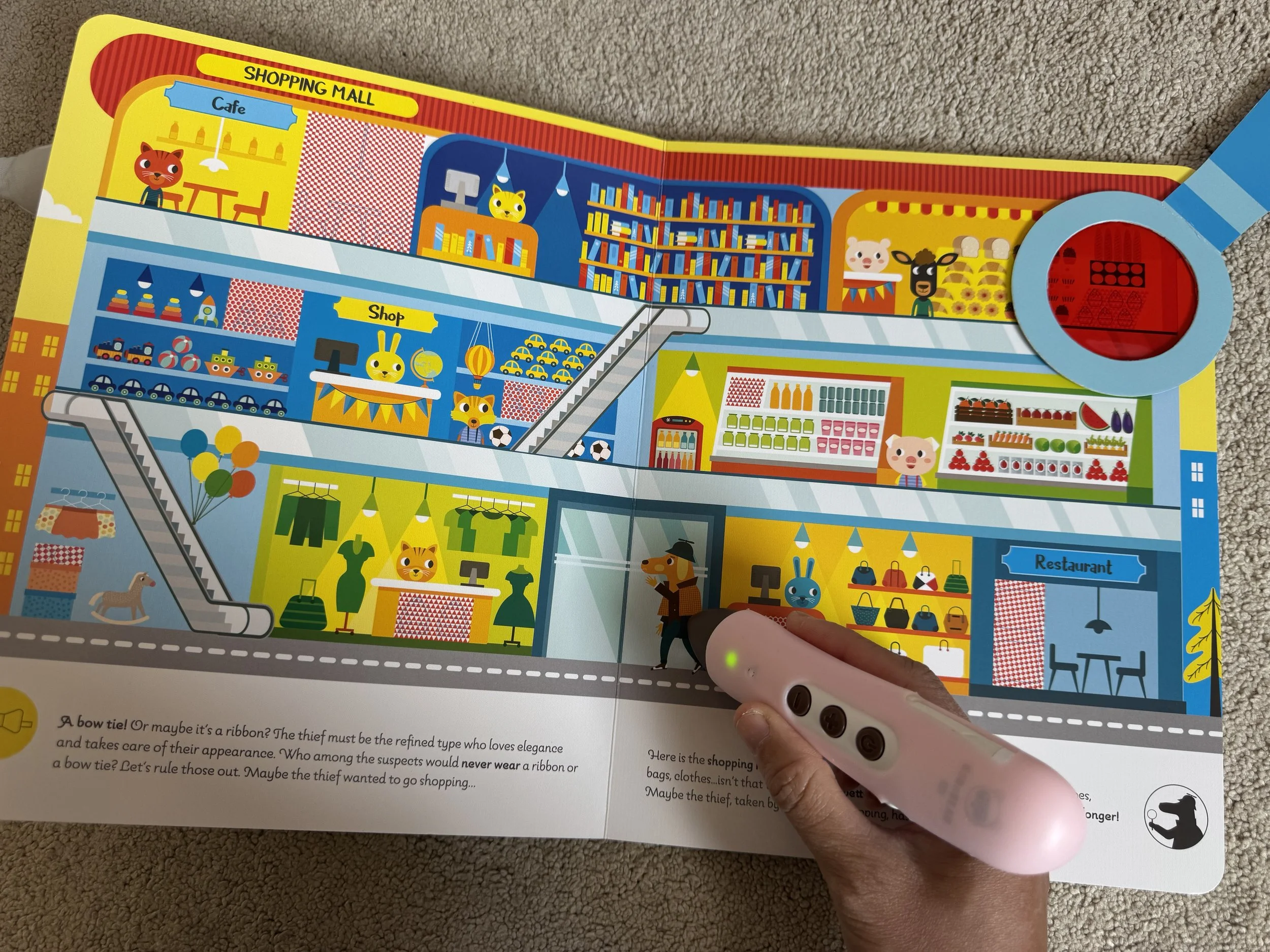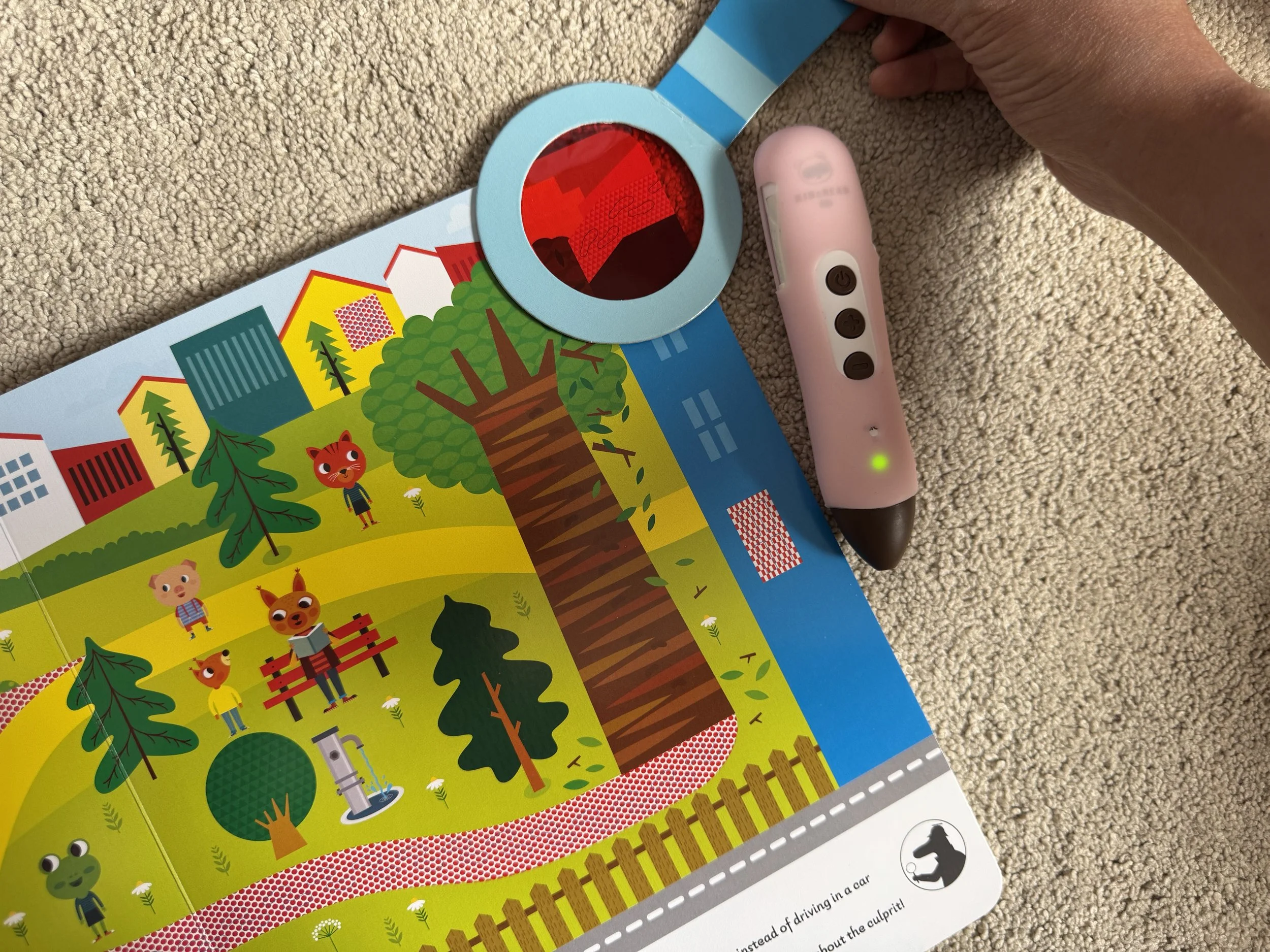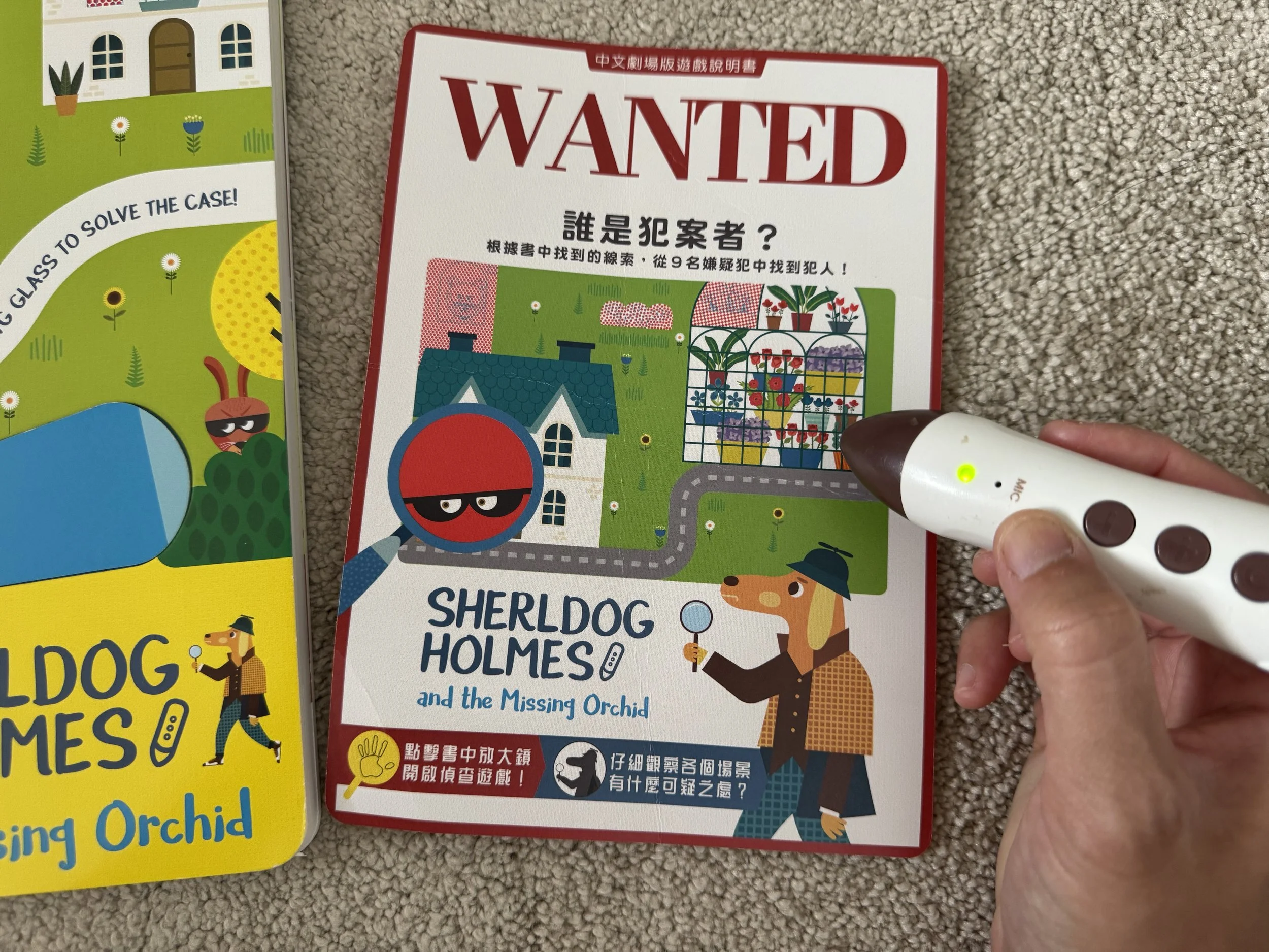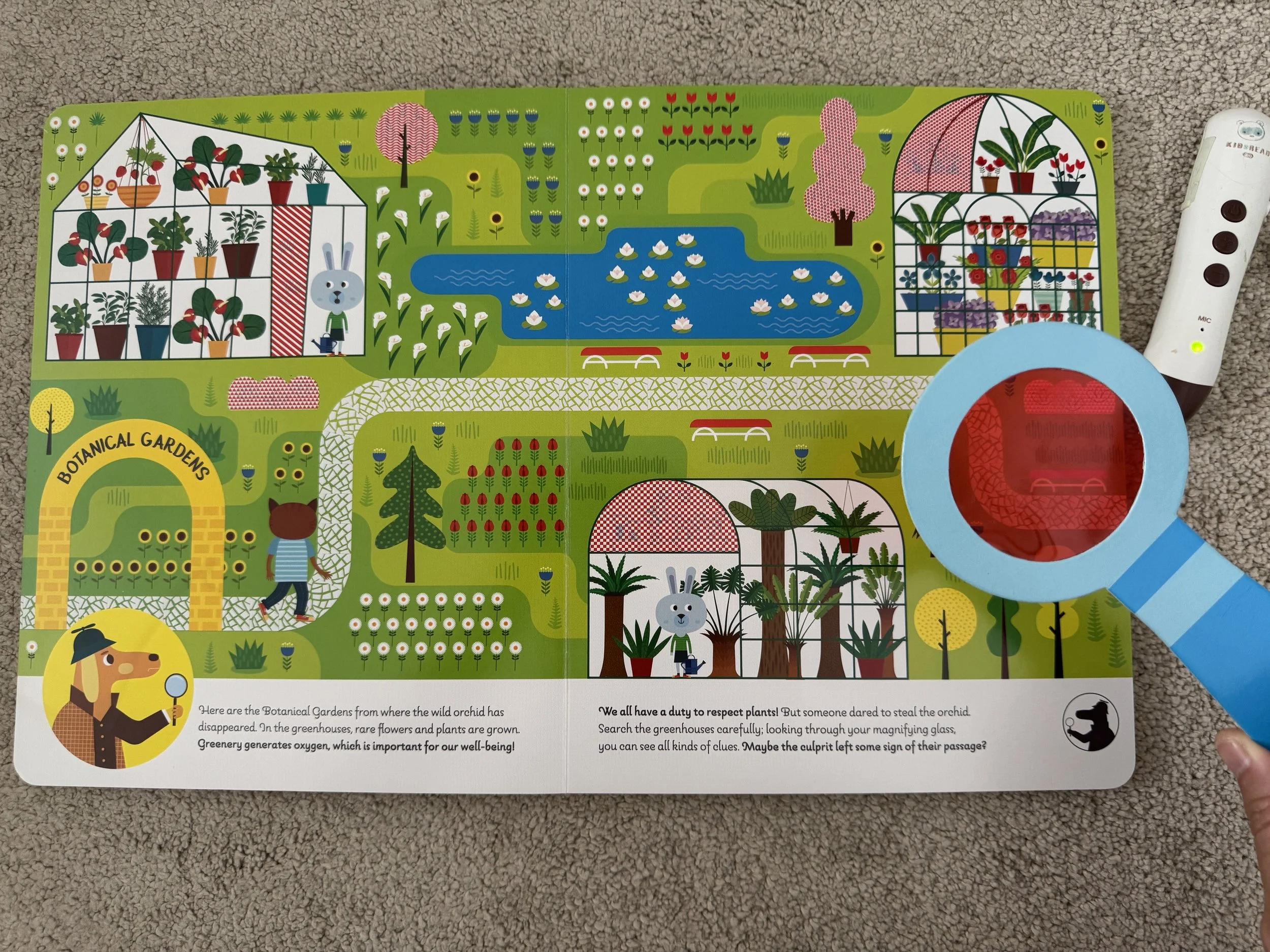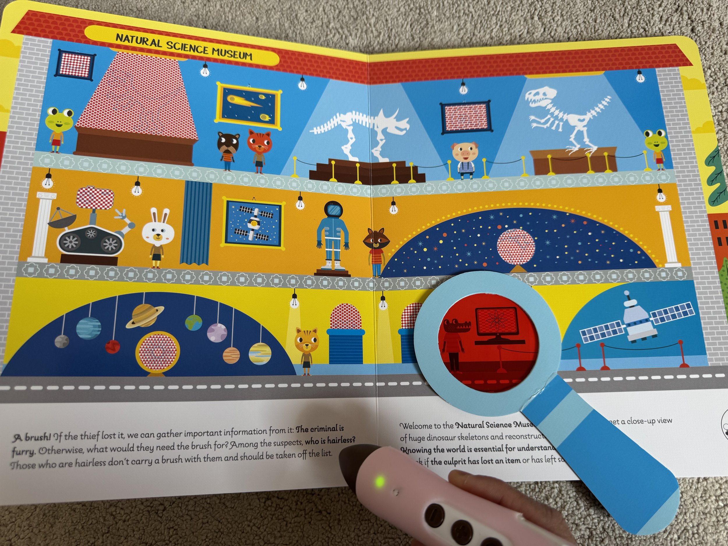 用點讀筆點放大鏡會說:「Use me to solve the case.」(用我來破案)