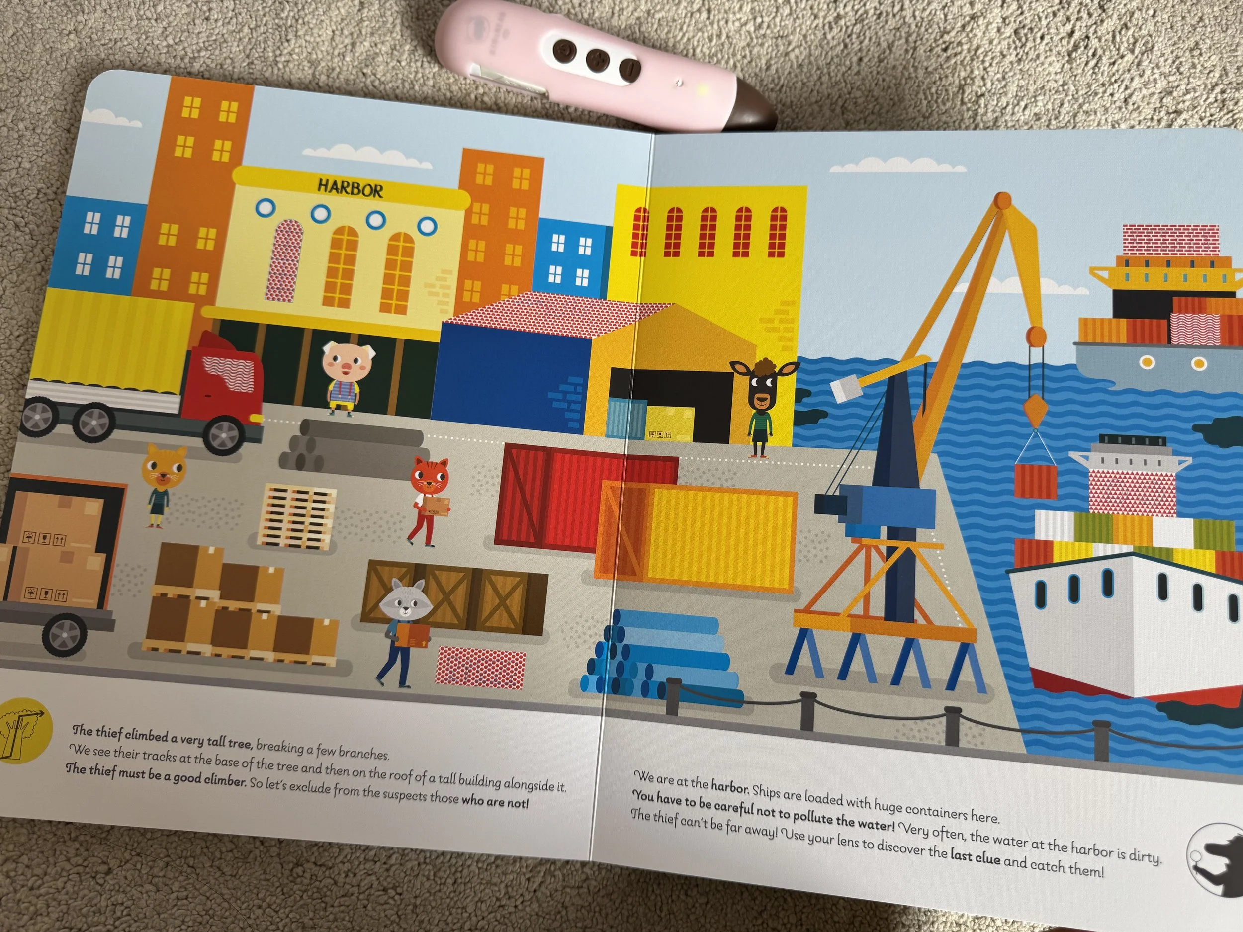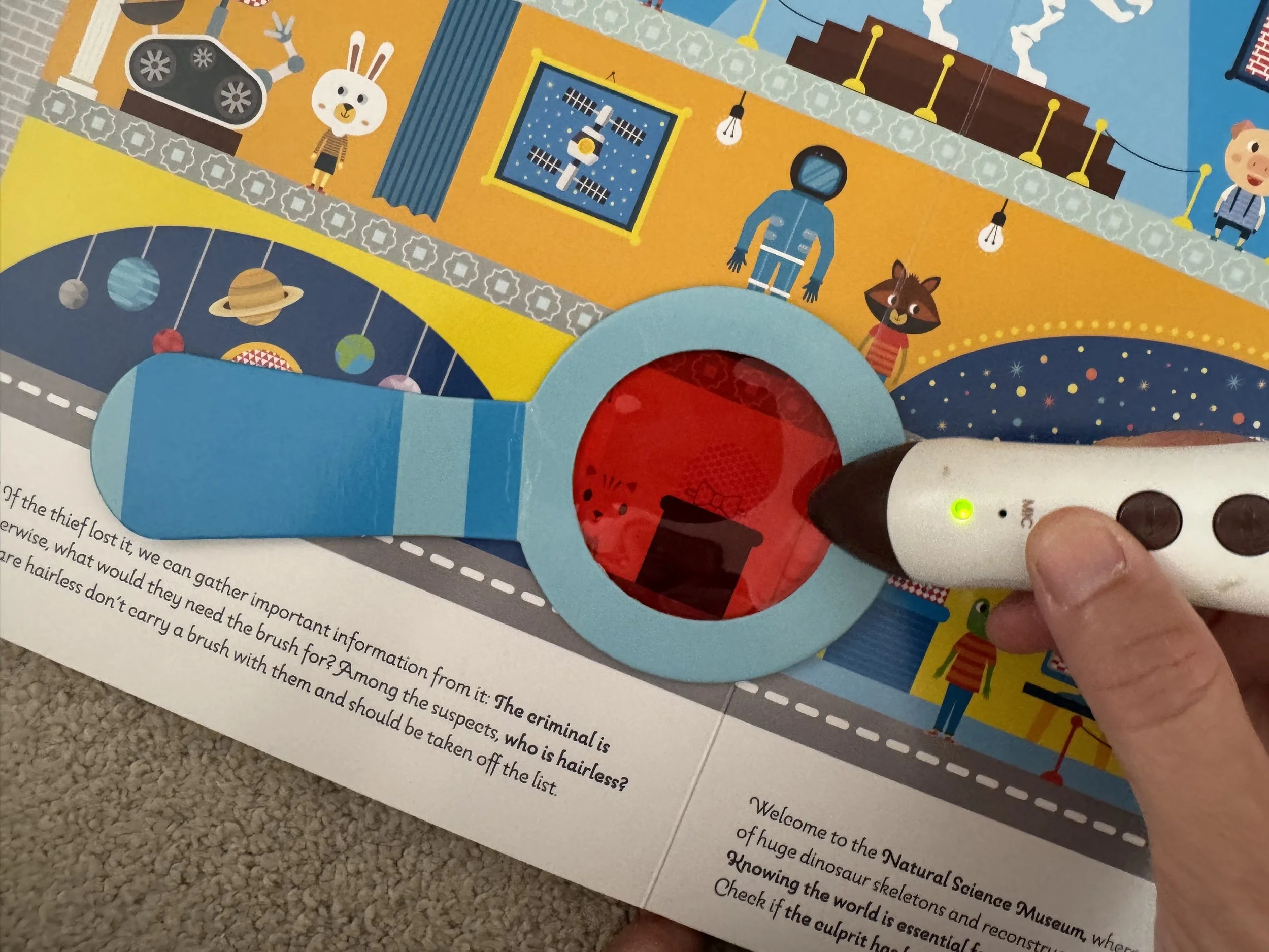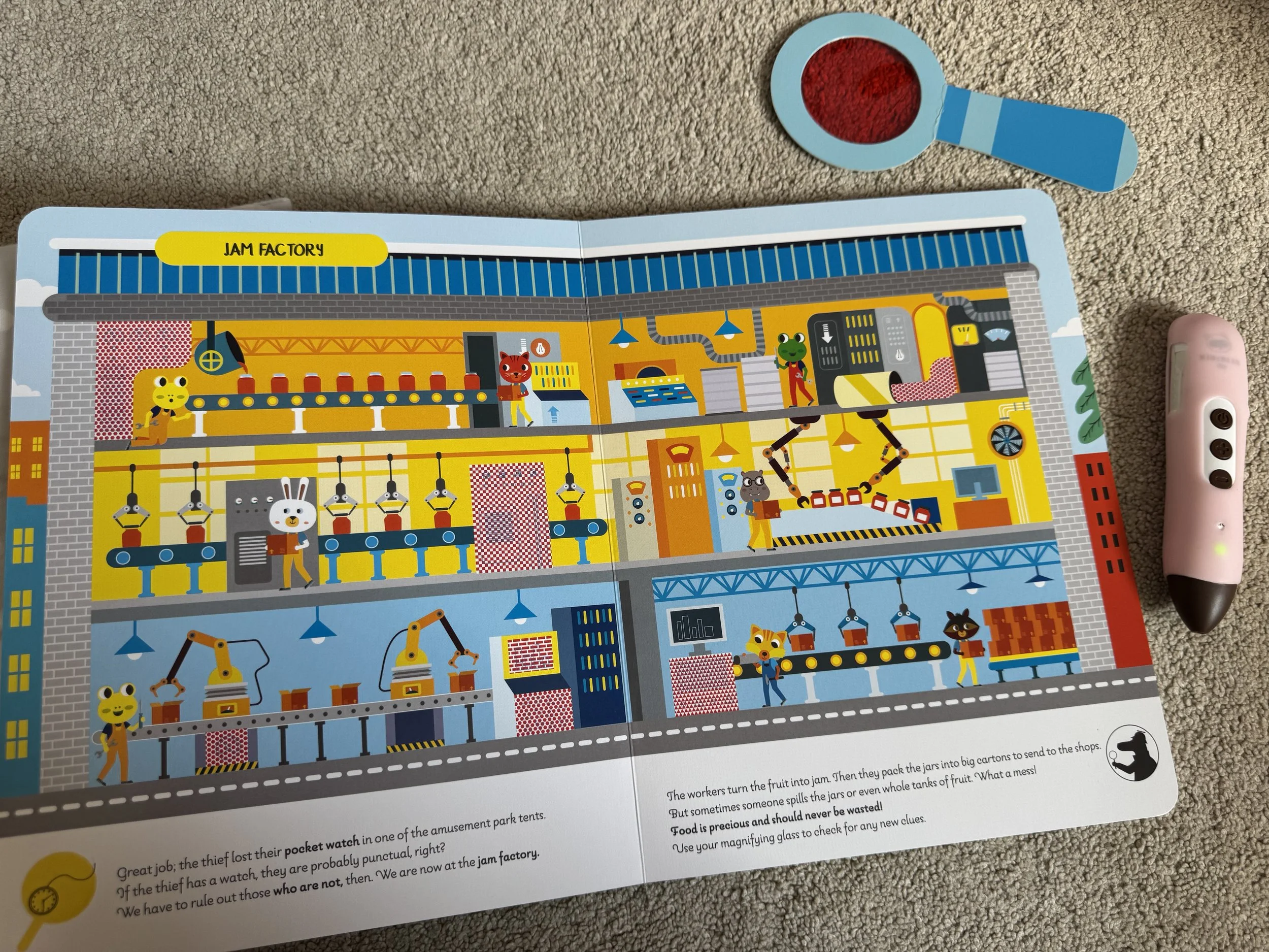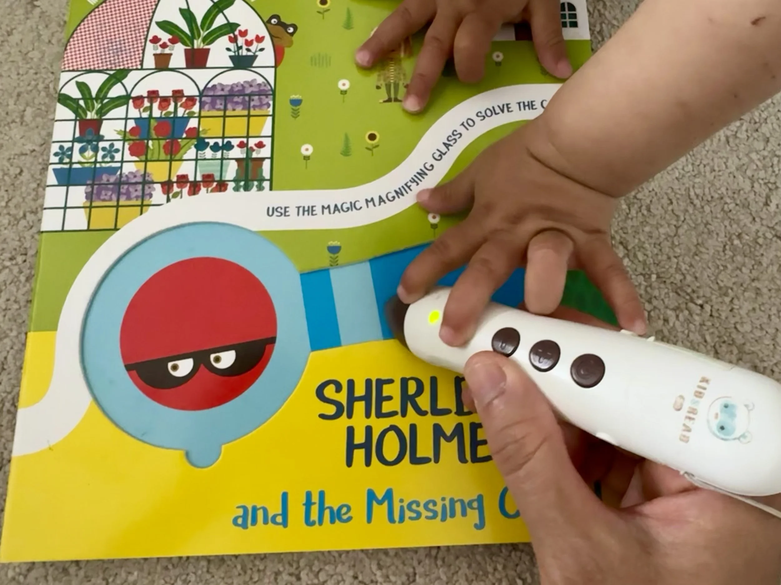 用點讀筆點放大鏡會說:「Use me to solve the case.」(用我來破案)