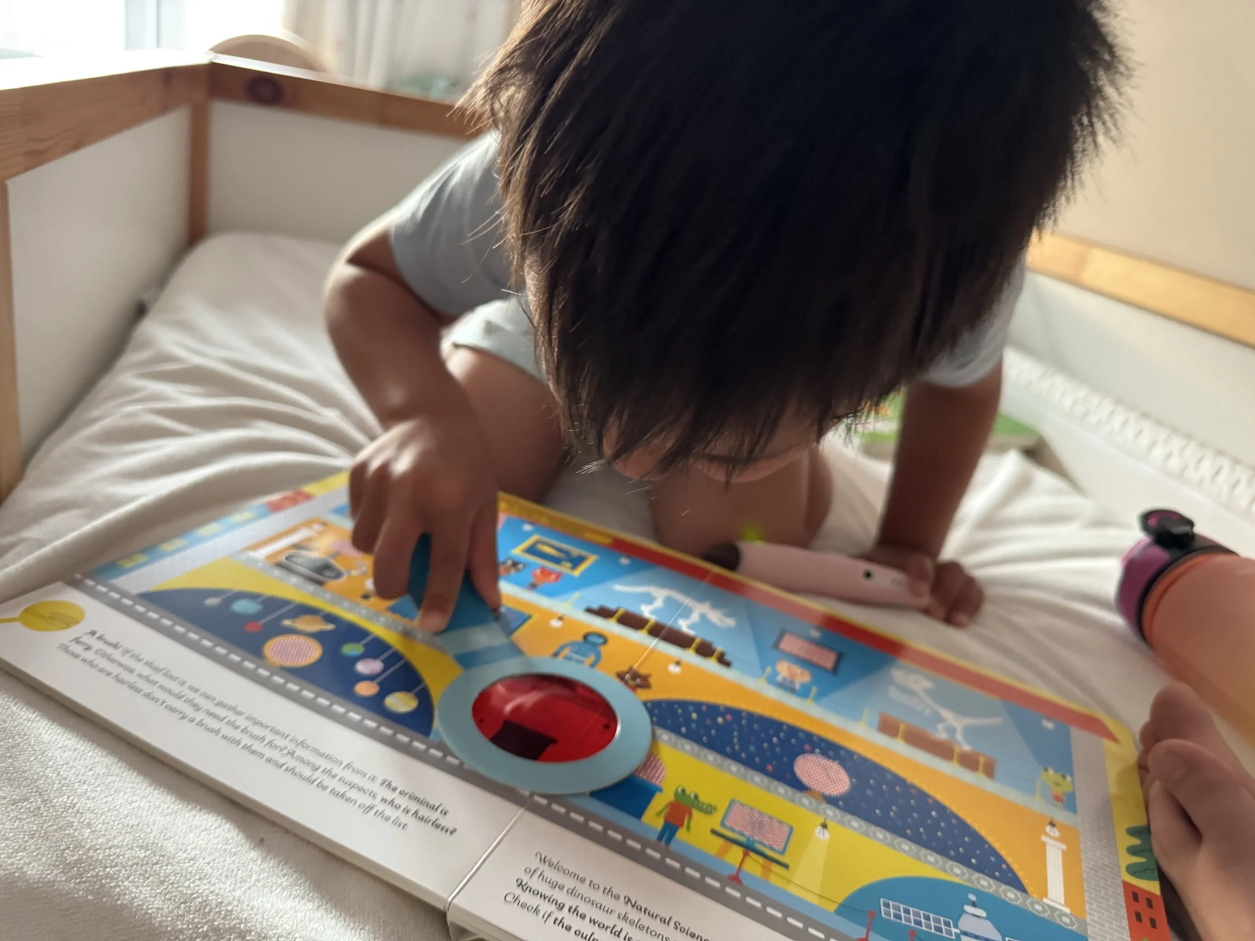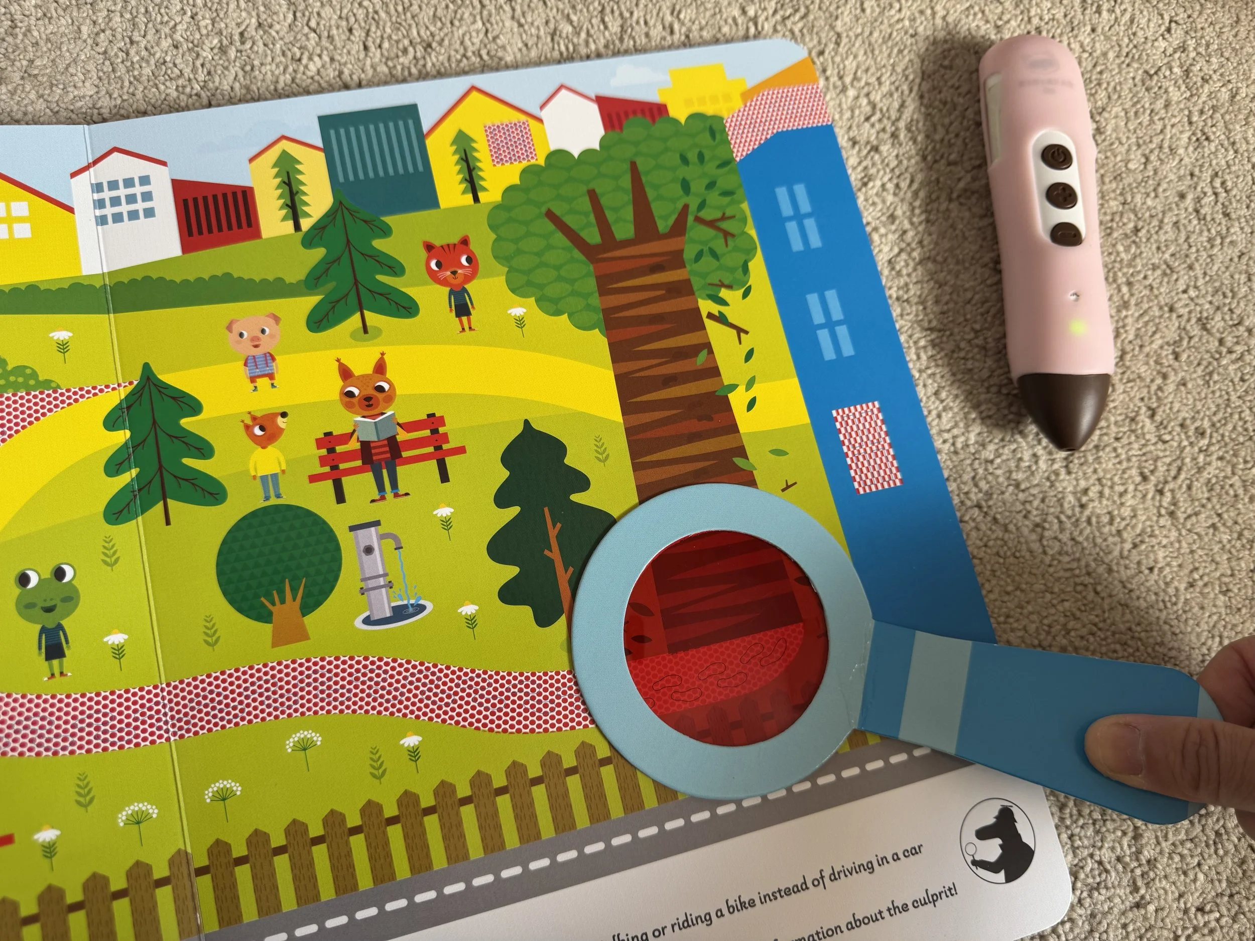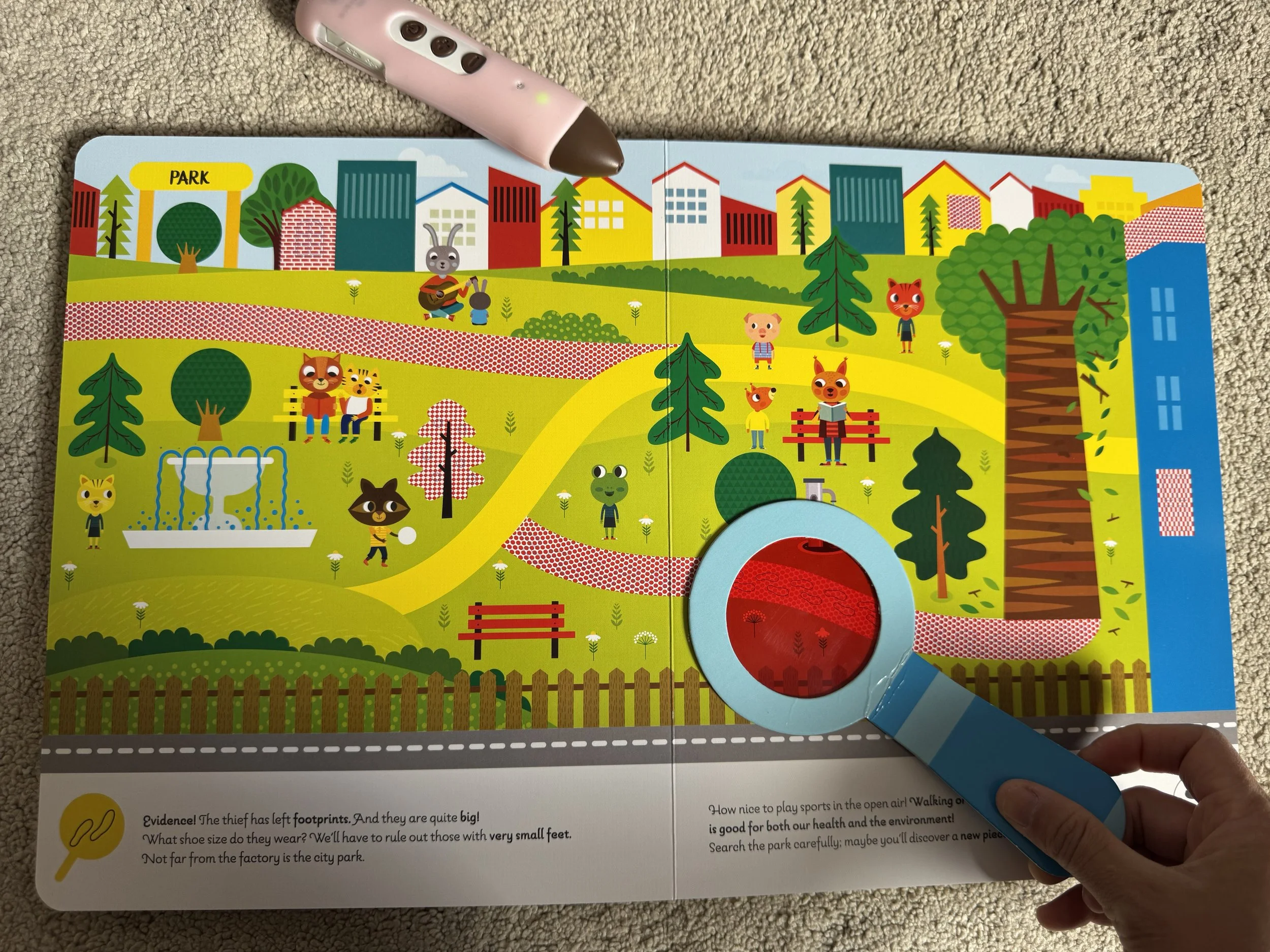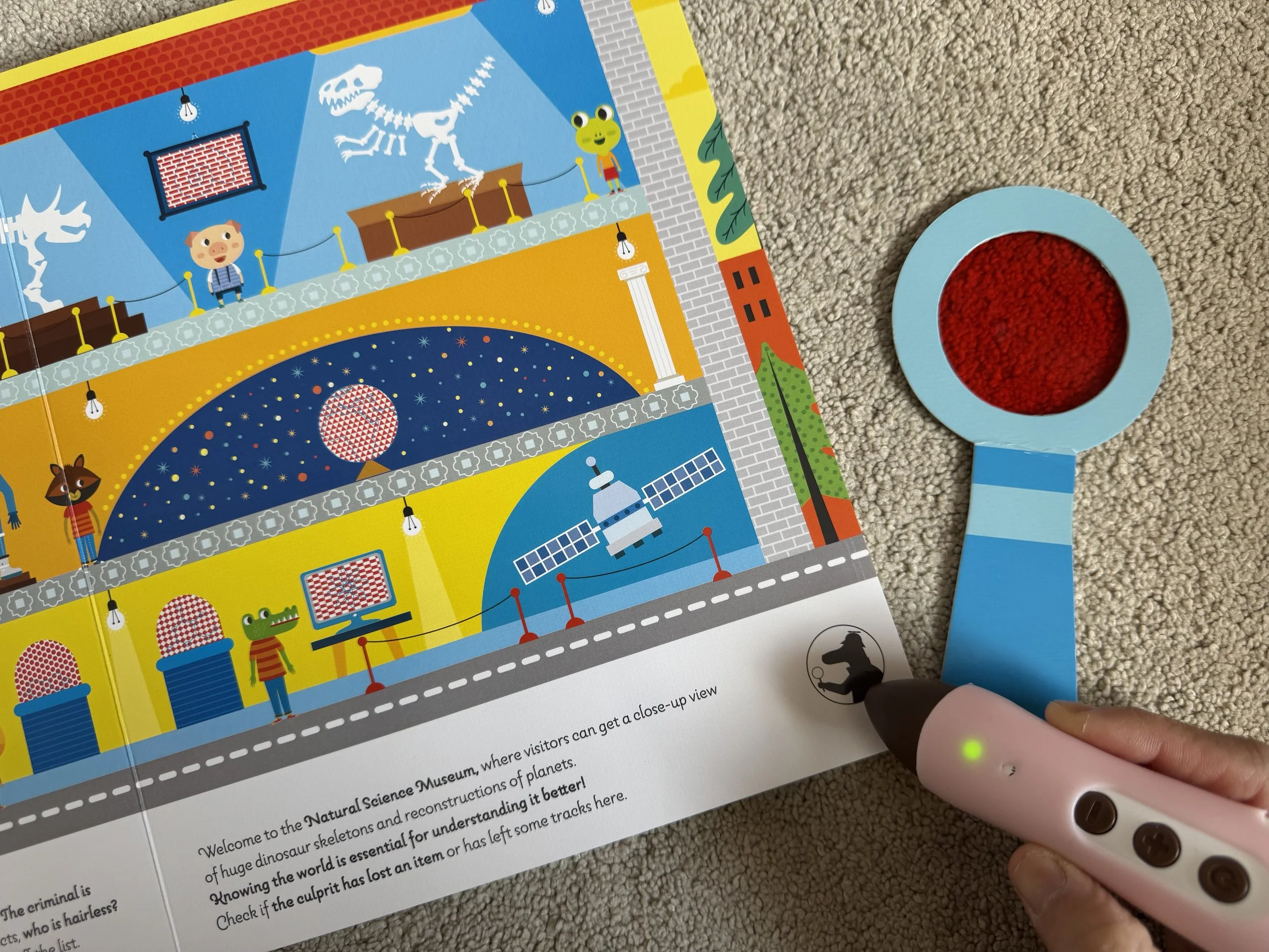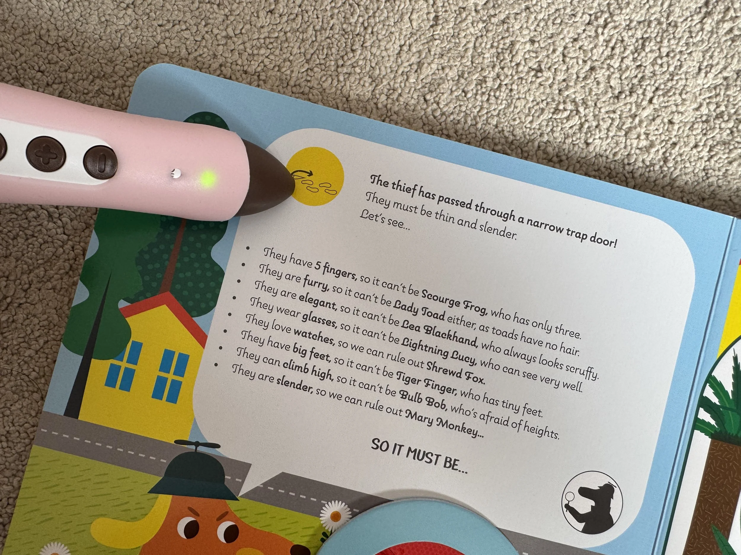 用點讀筆點放大鏡會說:「Use me to solve the case.」(用我來破案)