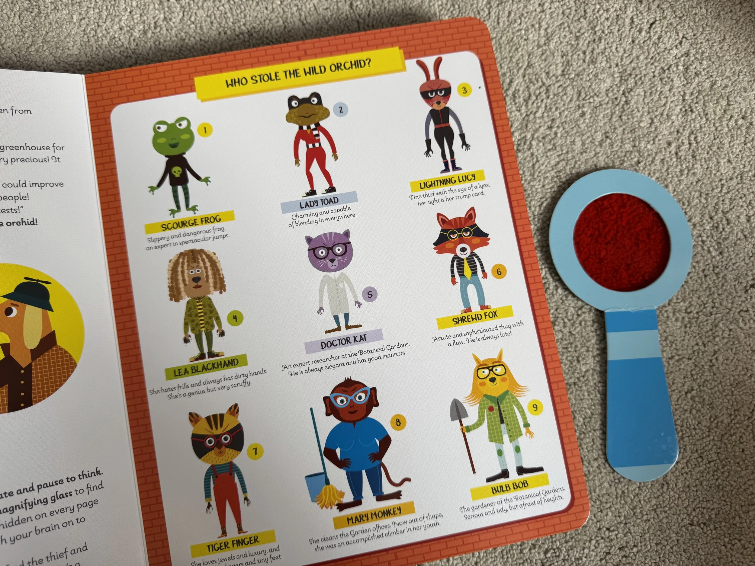 點選跨頁左下角的黃色放大鏡,會播放上一頁找到的證據/嫌犯留下的線索,協助孩子們排除不可能的嫌疑人,縮小嫌疑人範圍。