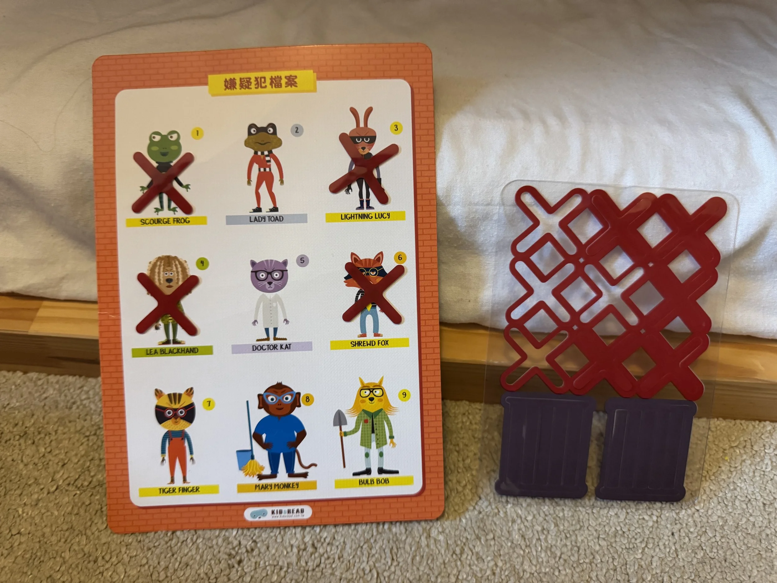 中文劇場版遊戲說明書(小卡背面是嫌疑犯檔案),搭配👇一張透明果凍嫌犯標記貼紙玩(可重複撕貼,不傷書頁)。