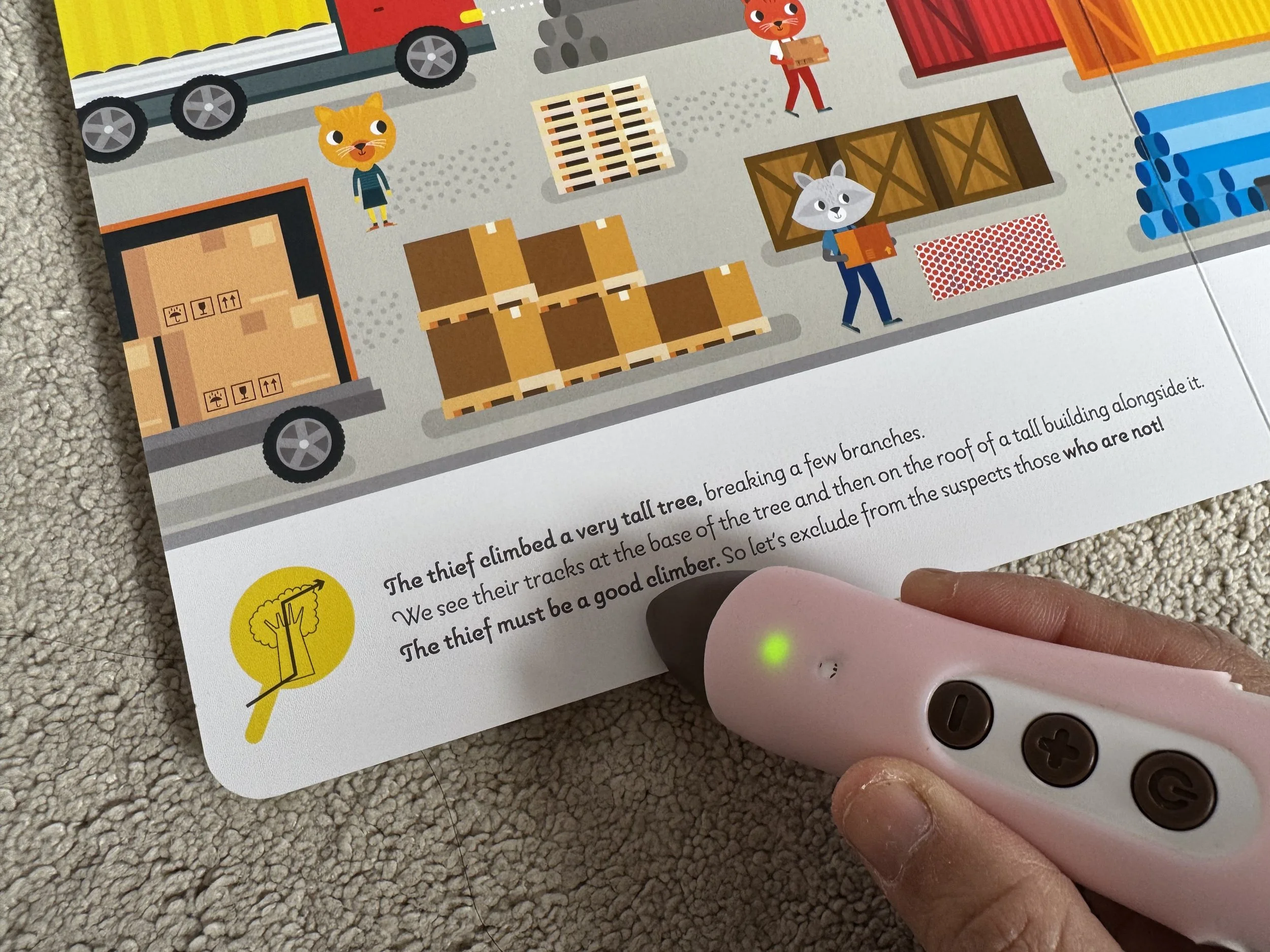 小偷是不是在這裡掉了什麼東西?拿起放大鏡仔細找找,有沒有什麼奇怪的地方?請用點讀筆點擊你所找到的線索。」