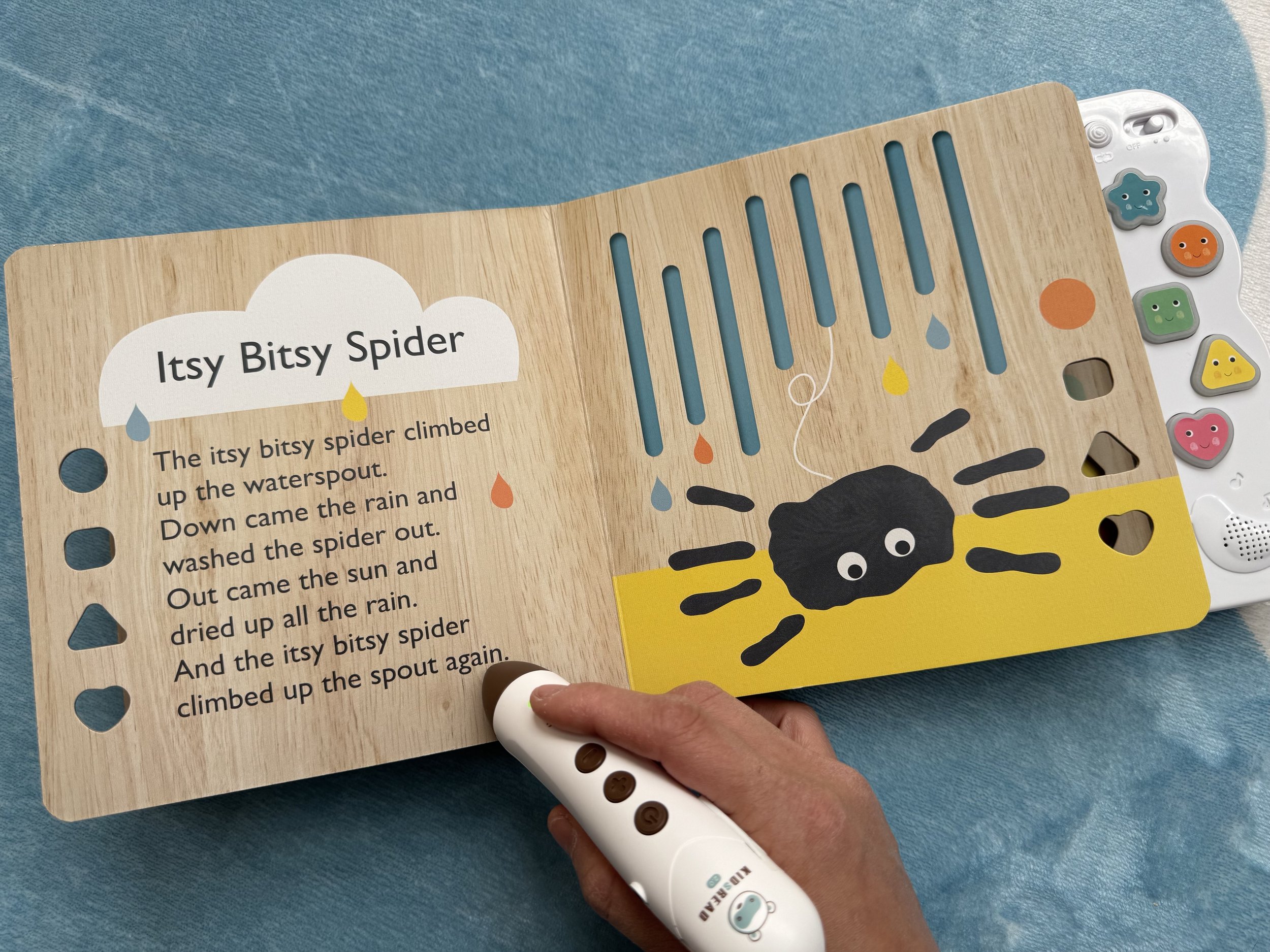 這個穿線板本身也是點讀小卡,用 KidsRead點讀筆 點選星星上方的浣熊/ 點讀筆圖示 就會立即播放整本書的四首童謠唷!