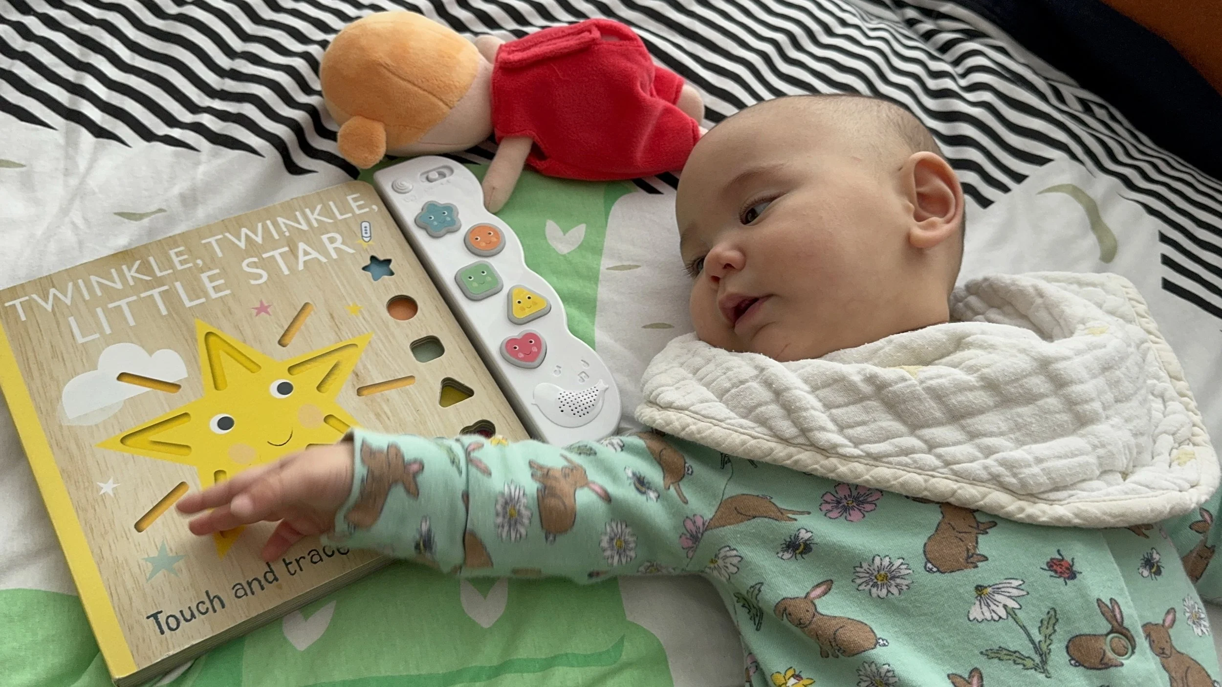 有時候我會把星星板放在嫩嬰的搖籃旁,手上沒書時也可以播放給她聽。