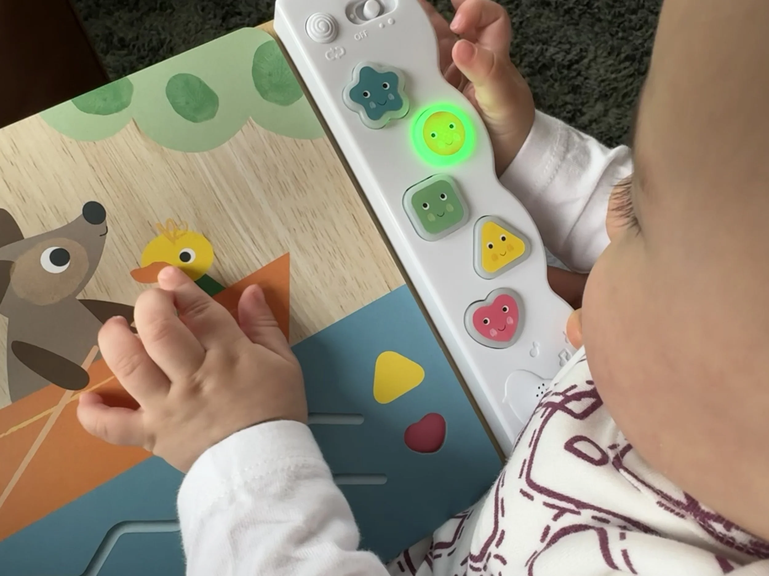 每次寶寶哭哭時,我就會趕快去找這本書出來,按下右手邊的音樂按鈕會播放很優美又動聽的童謠旋律(純音樂),立刻就能轉移寶寶的注意力,屢試不爽。