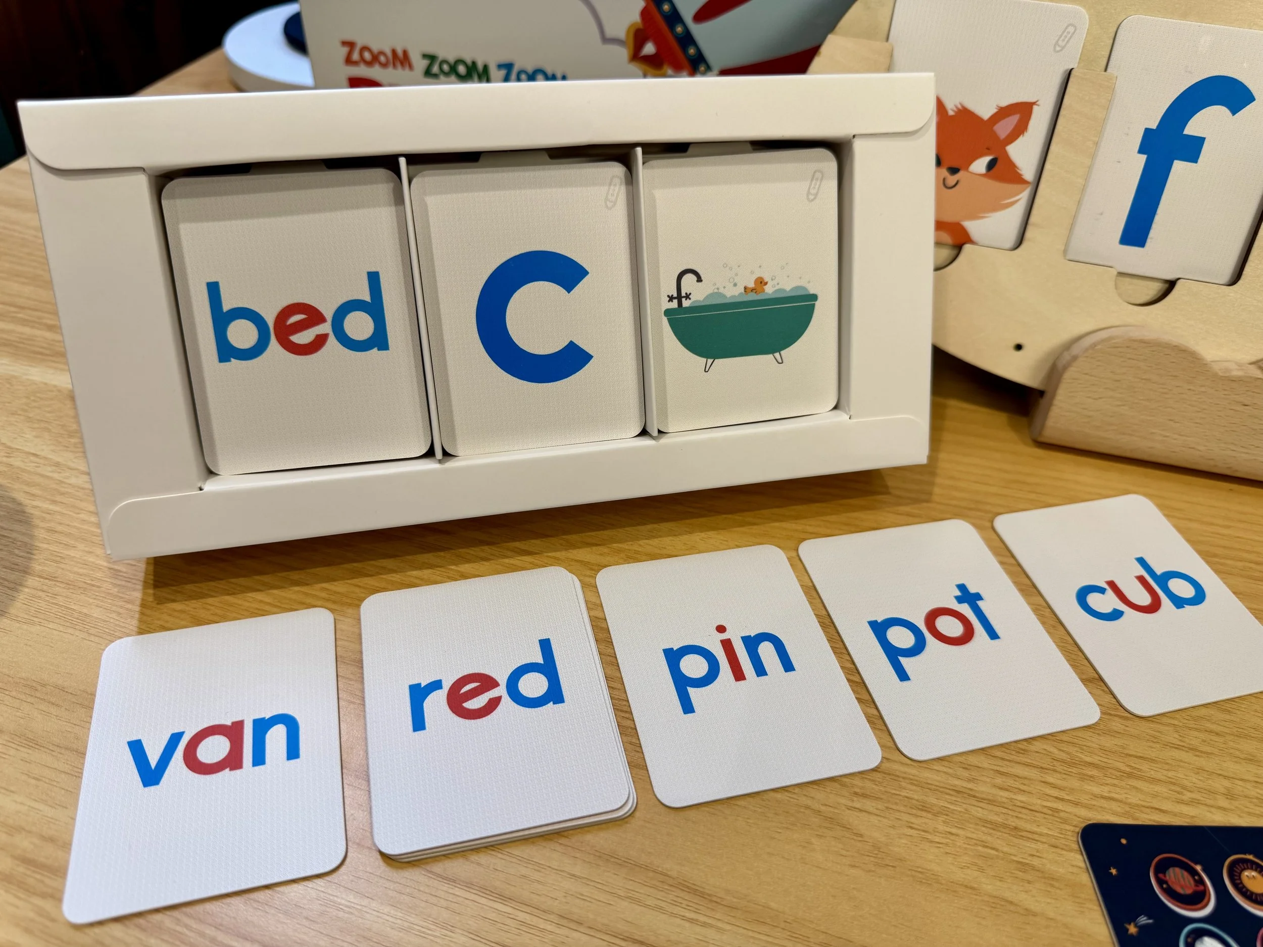 卡片的正面是對應單字的插圖,反面則顯示 CVC 單字,其中紅色字母表示母音,而藍色字母表示子音。