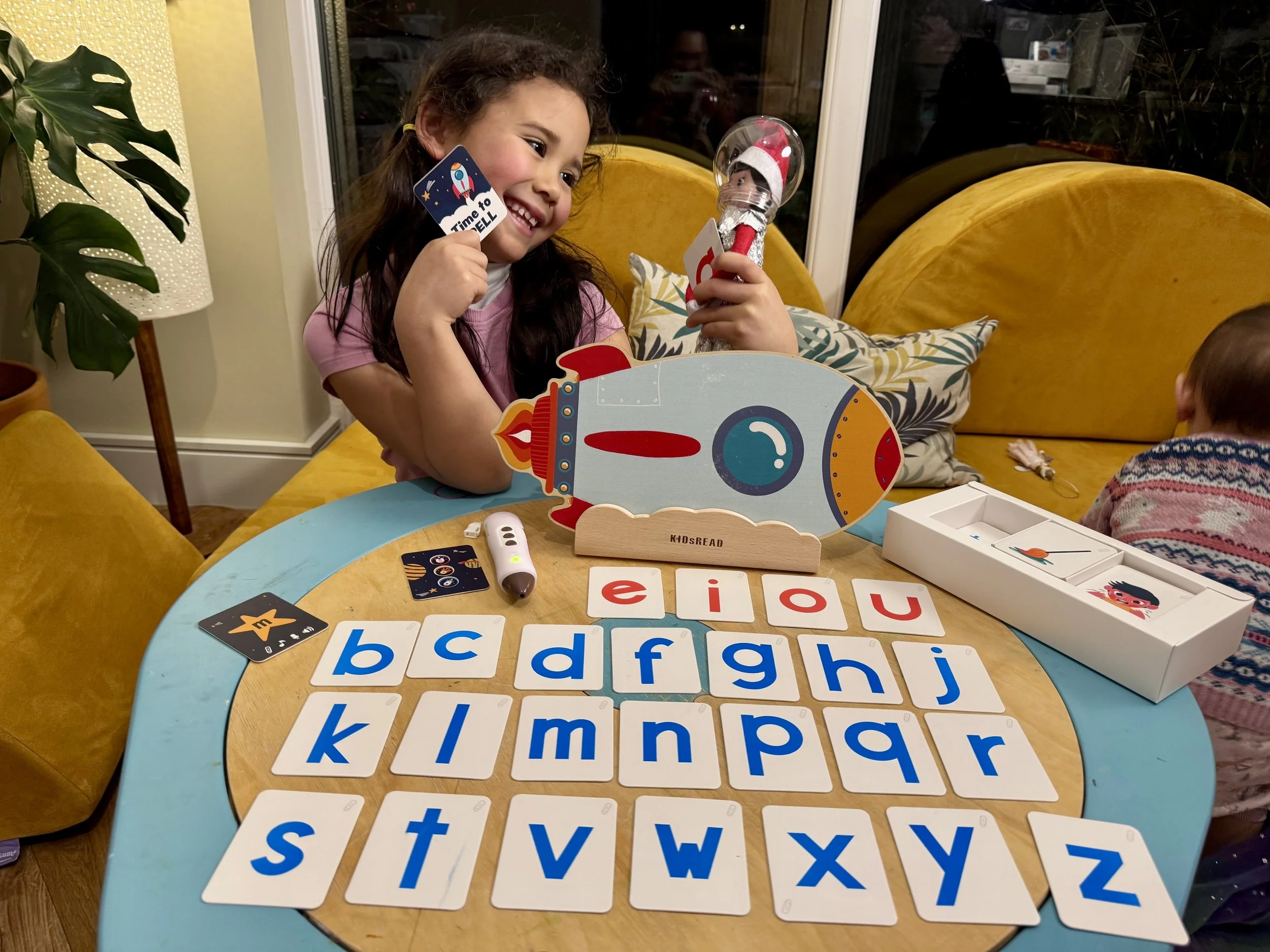 小火箭本身是木質教具,一面放字卡、另一面是精緻的火箭圖樣,平時還可以當遊戲房裝飾或是開放式玩具。